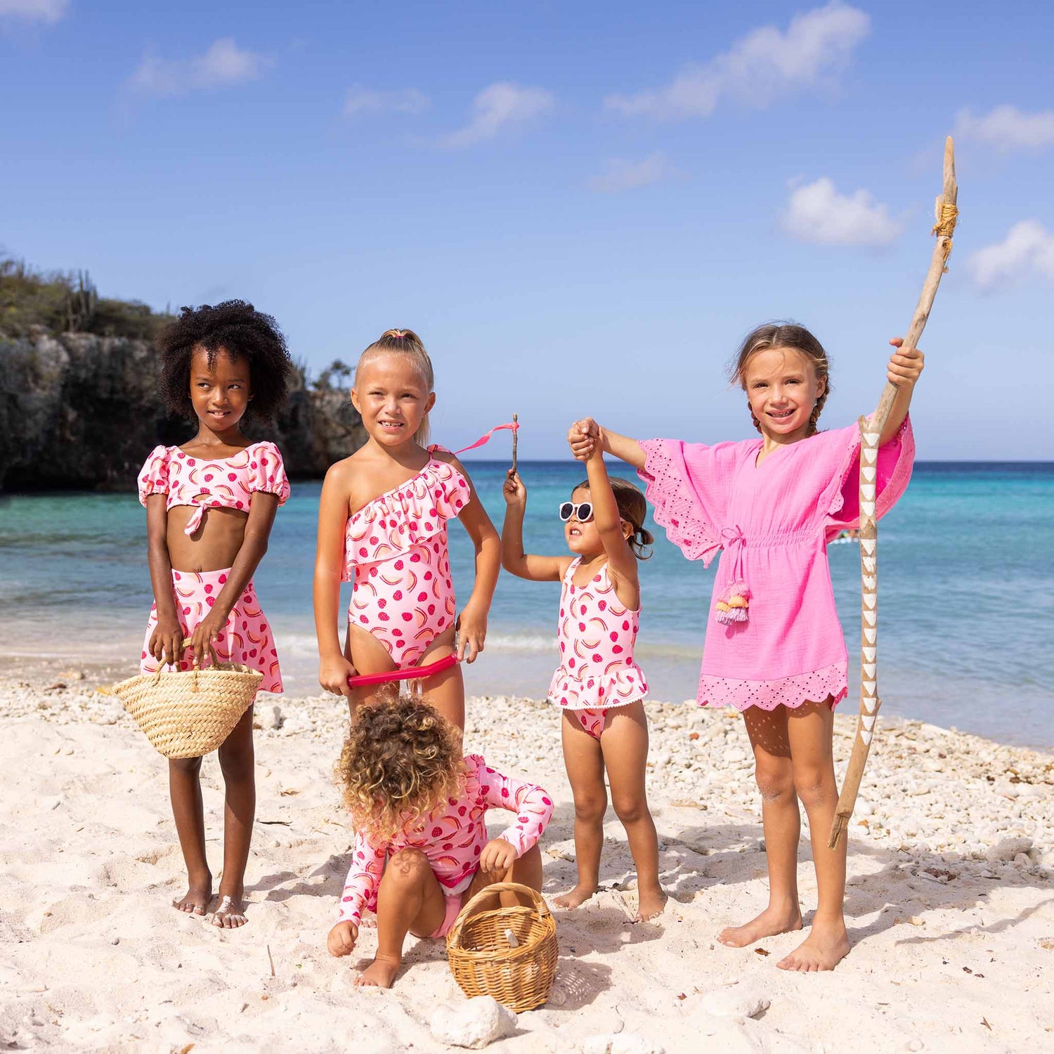 Make a splash with this one-shoulder girls' swimsuit, adorned with a bright and bold watermelon print and a chic shoulder frill. A sweet bow accentuates the left shoulder, adding a touch of elegance to this stylish, sun-protective piece perfect for any summer adventure.