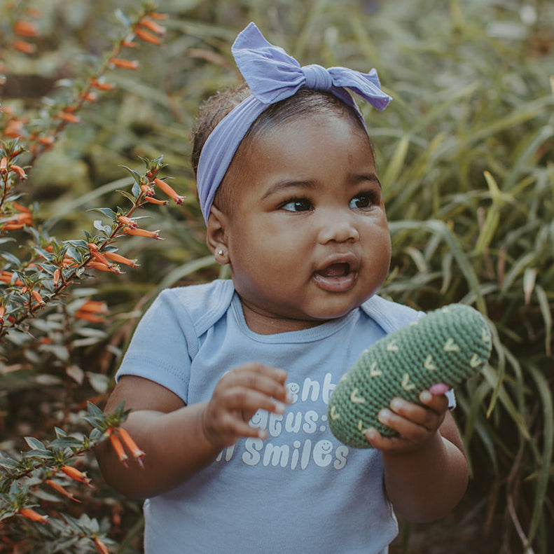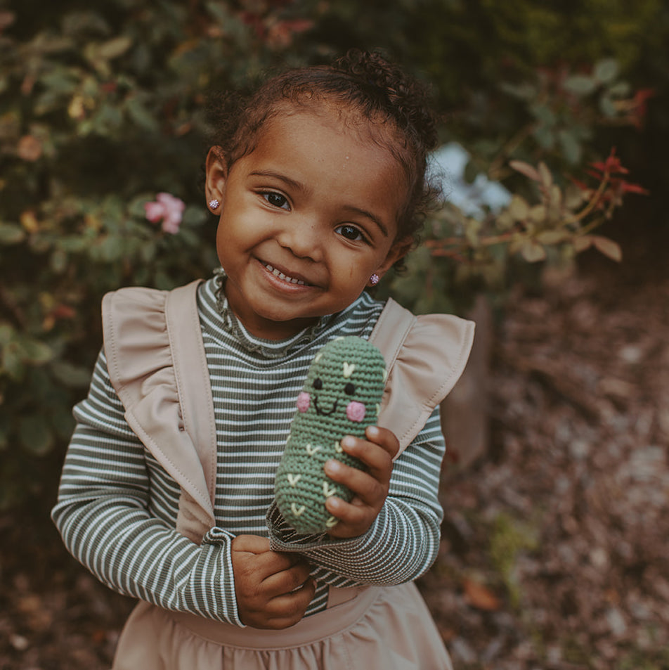 Calling all Pickle lovers, sweet and sour, to see what just popped out! Pebble's new Friendly Pickle Rattle is making a big splash. Handmade with soft cotton yarn, he's covered in speckles and is always smiling. Pairs will with Pebble's Friendly Fruit and Veggie Collections.