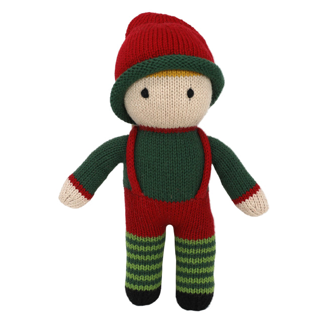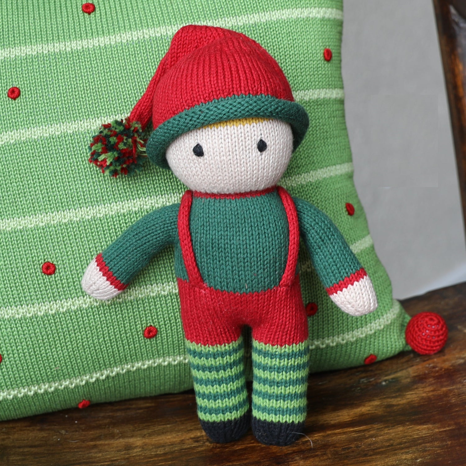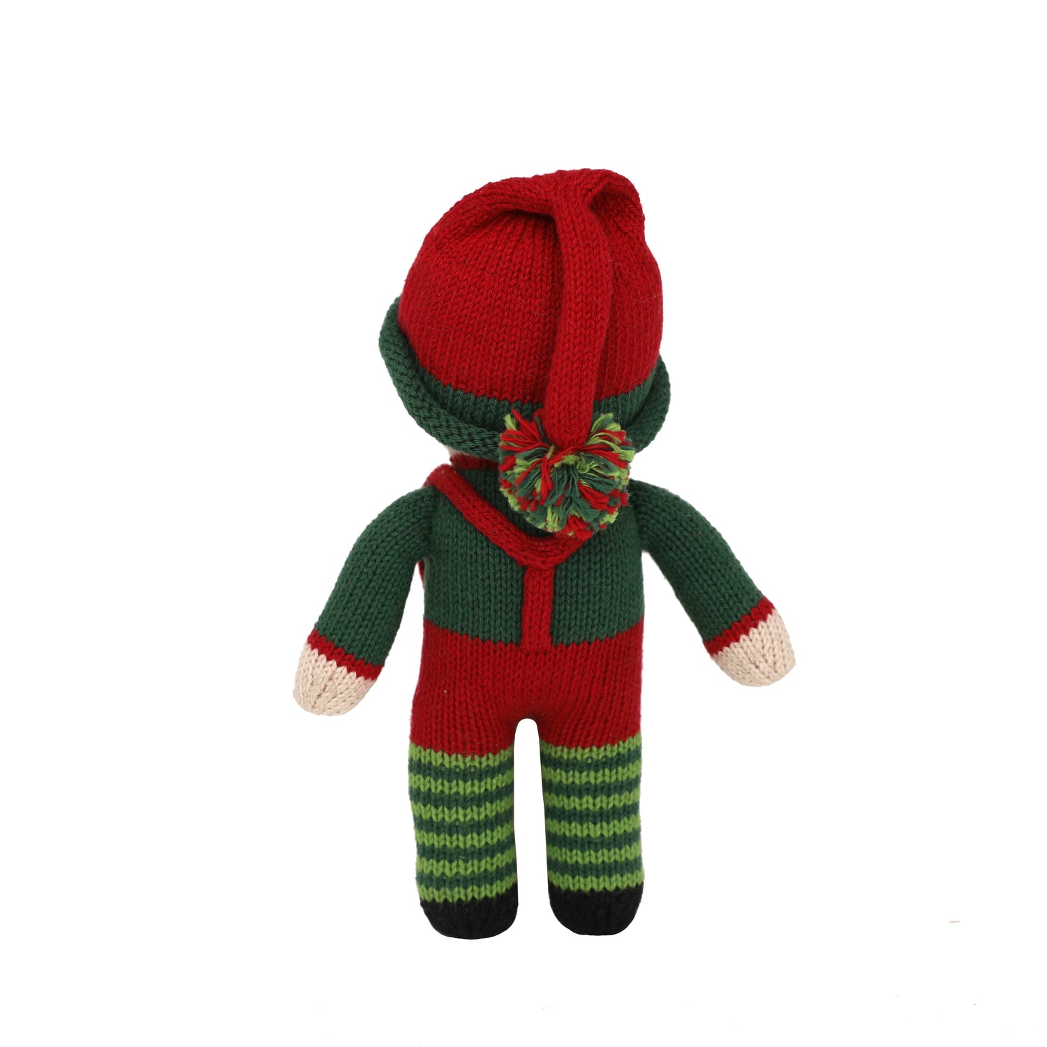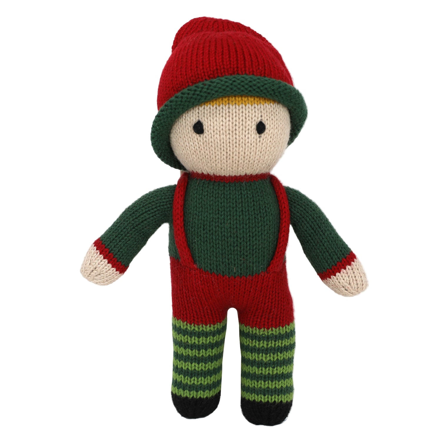 Dressed in festive green and red with delightful striped leggings, this little elf is ready to spread holiday cheer. His soft knit fabric makes him perfect for cuddling, while his bright red hat and suspenders add a playful touch to his look. Whether used as a decorative piece or a snuggly friend, this elf boy is sure to become a beloved part of your holiday season.