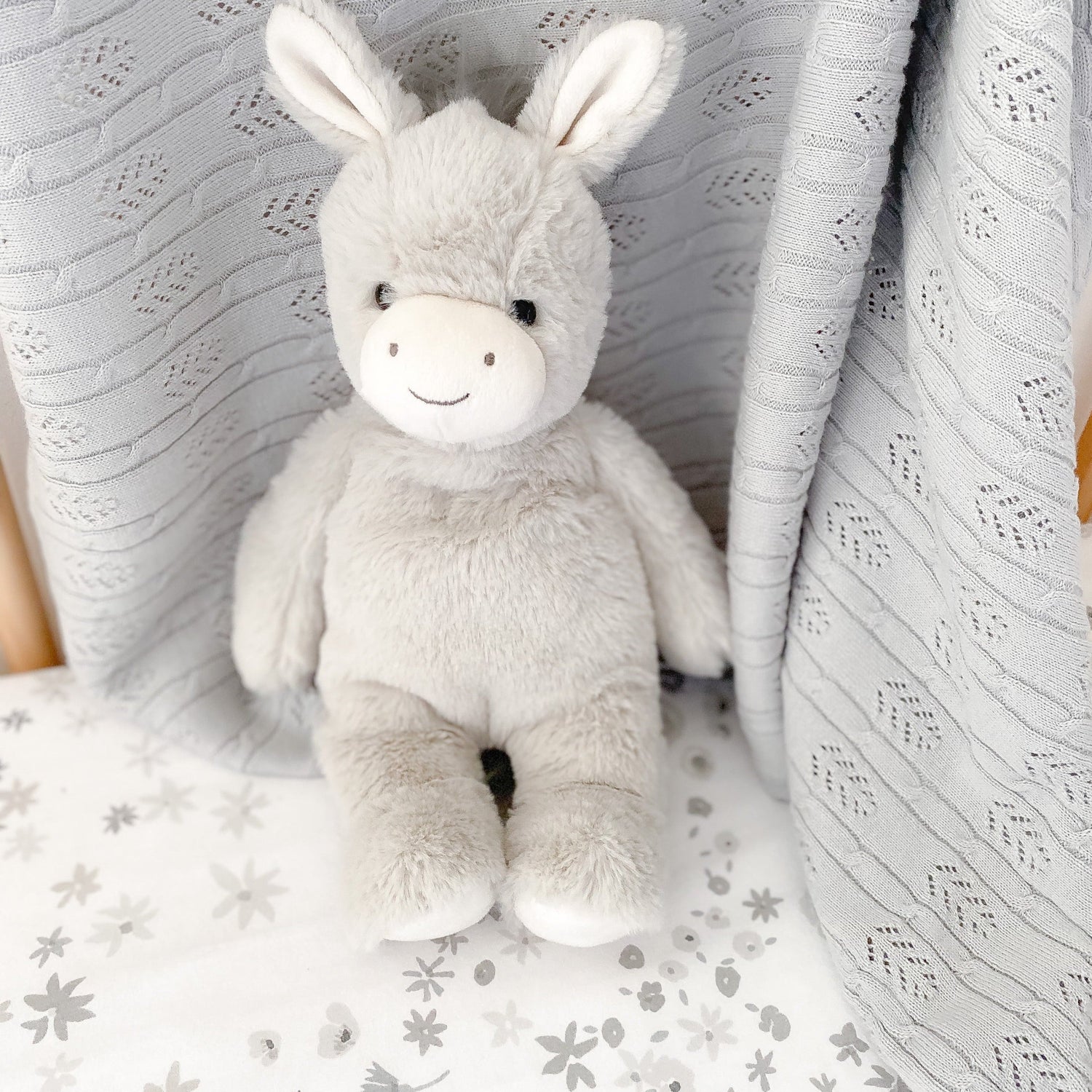 Hee-haw, hee-haw! Moses the donkey plush toy makes his grand entrance with a cute-as-can-be face, ultra-soft grey fur and swishy tail. Floppy, go-anywhere feet ensure this donkey plush toy will have his share of adventures—from playtime to movie time to bedtime.