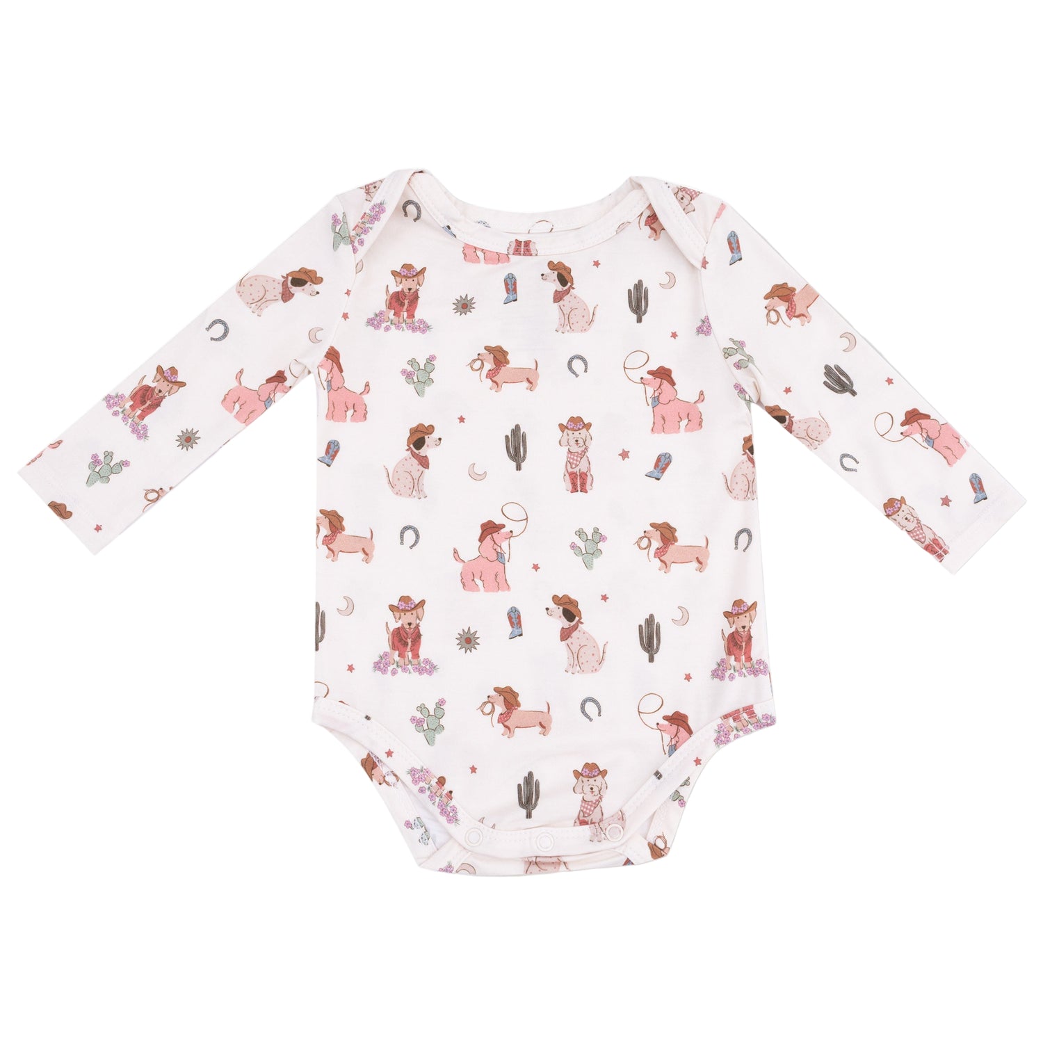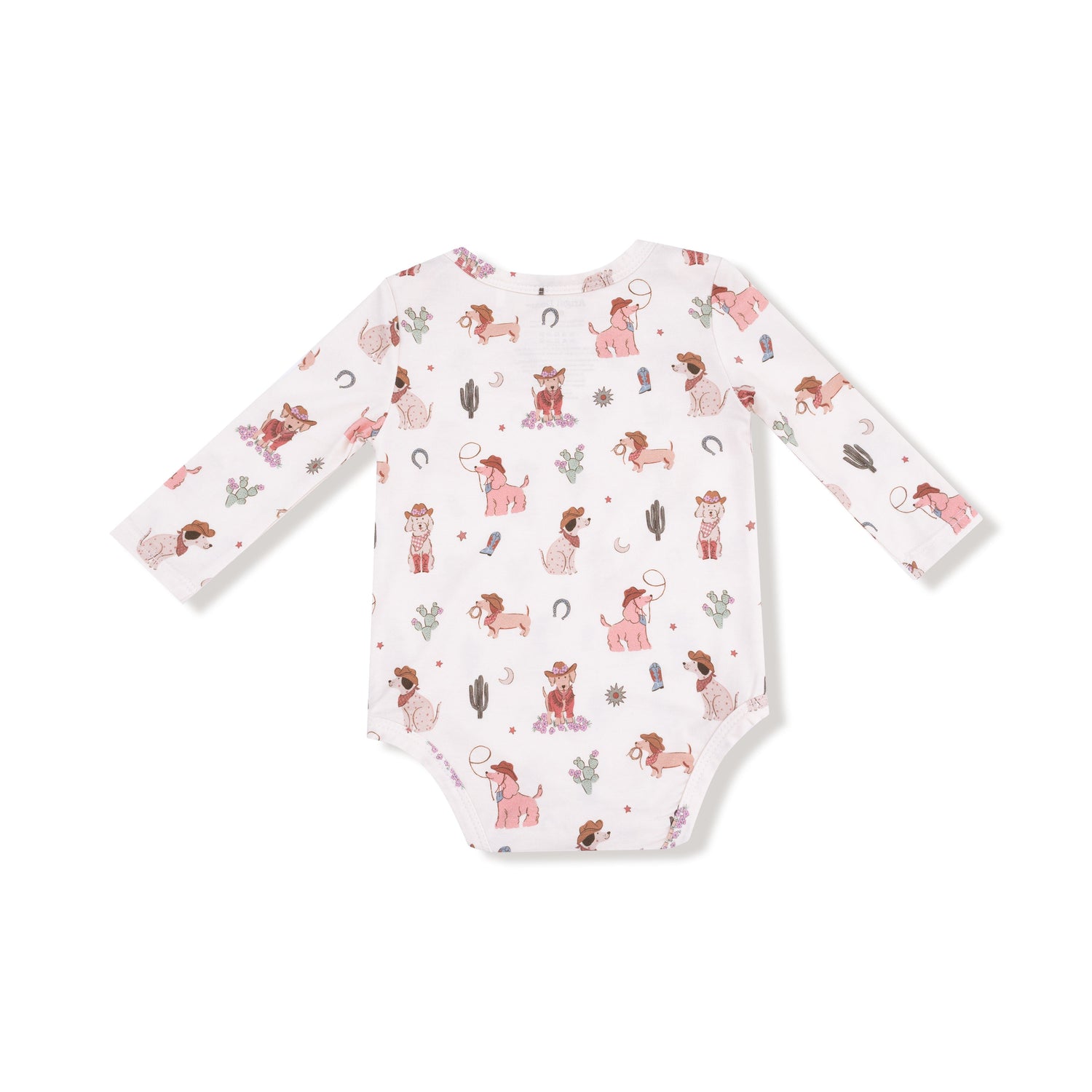 Lap Shoulder Bodysuit - Cowgirl Dogs - 0-3M is backordered and will ship as soon as it is back in stock.