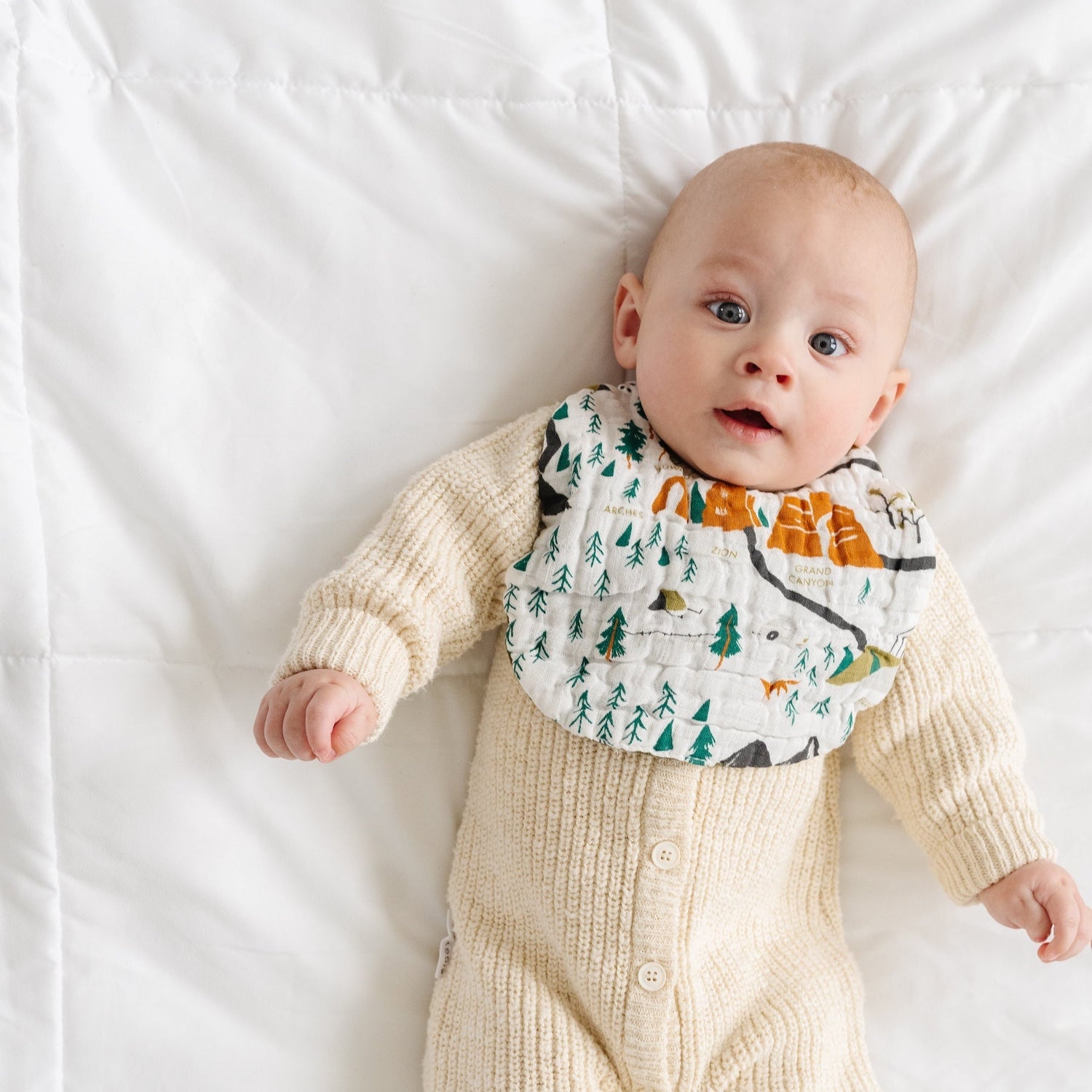 Meet our reversible National Parks Bib! One side is a connected pattern of some of our favorite National Parks, on the other, a deep forest green. Two options, both absorbent and adorable. Perfect for first foods, teething, and spit up, whatever you and your cutie need.
