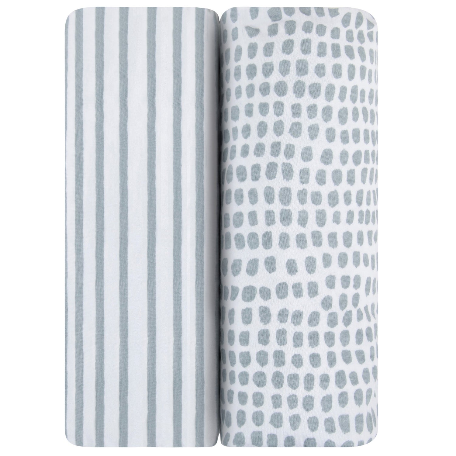The comfort of our soft and breathable, lightweight, 100% Superior Quality Combed Jersey Knit Cotton creates a buttery soft sleeping surface for your baby to sleep on. This convenient two-pack features modern classic, abstract stripes, and splashes patterns, designed in an exquisite misty blue to complement baby boy’s nursery décor. You can be rest assured that your baby’s sleep surface will always be covered and protected with a clean, stylish, and soft cotton sheet with this two-pack!