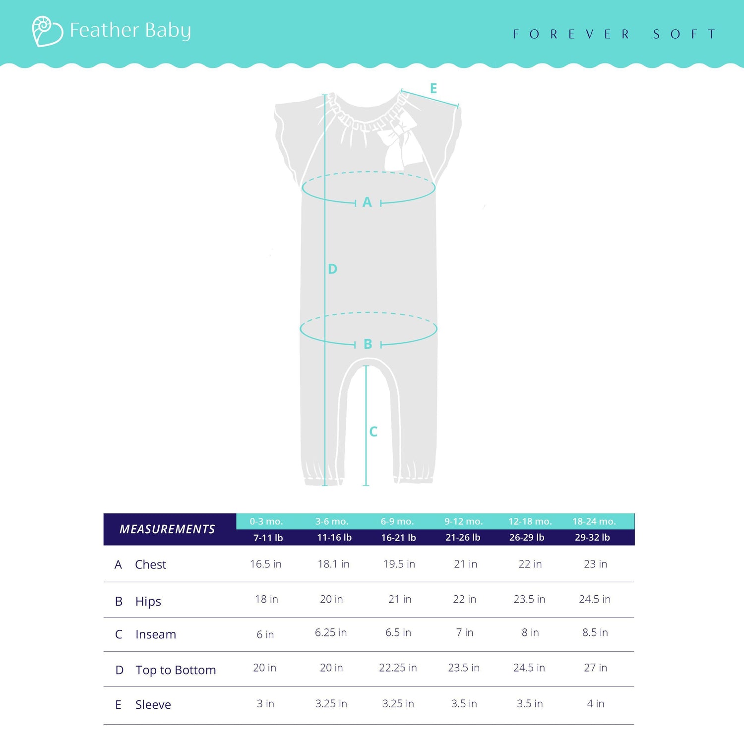Our short-sleeved Bow Romper is a Feather Baby classic: fluttery sleeves and an elastic collar that easily opens wide to slip over the baby's whole body. You'll love how easy it is to change the baby. Snaps are along the inseam.
