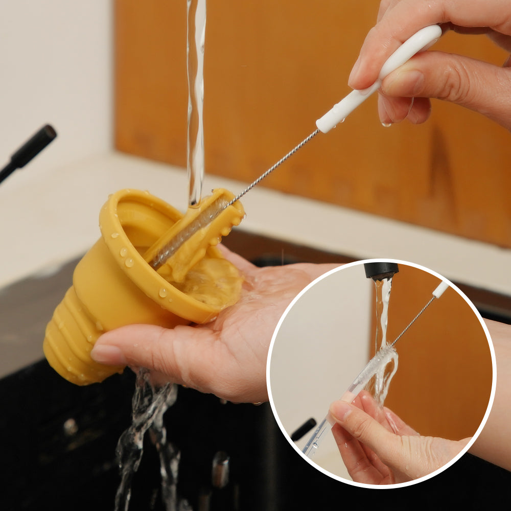 Use the tube brush included to clean small areas and corners. Hand wash the brush with warm, soapy water and rinse. Brush NOT suitable for sterilizing due to metal components. To sterilize non-metal parts, use a steam sterilizer or boil in water for 2-3 minutes. Do not use bleach-based agents to clean this product. Silicone may absorb the colors of foods it comes in contact with. To minimize discoloring, wash immediately after use. Store product in a cool, dry place and avoid direct sunlight.