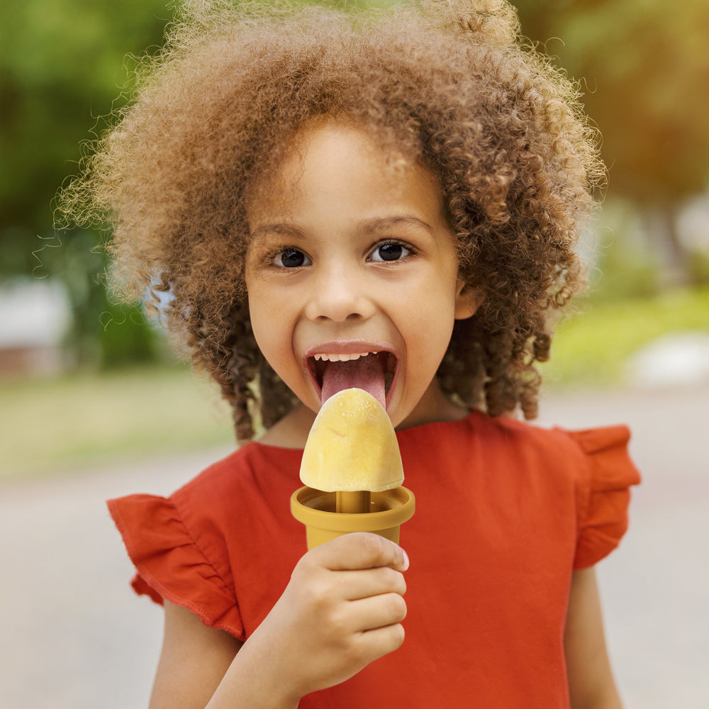 - Adorable ice cream cone mold fits little hands and catches drips.