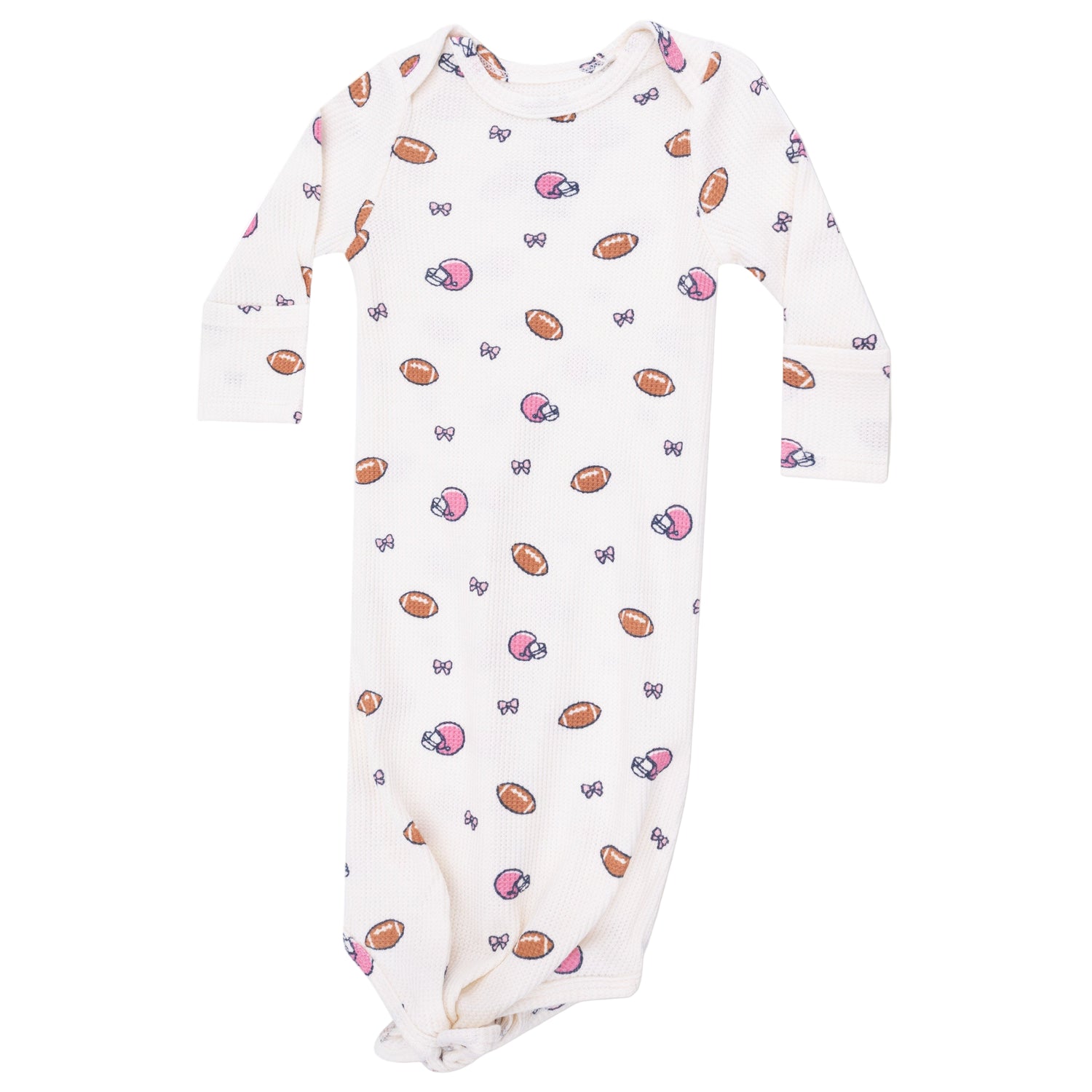 Knotted Gown - Footballs and Bows - 0-3M is backordered and will ship as soon as it is back in stock.