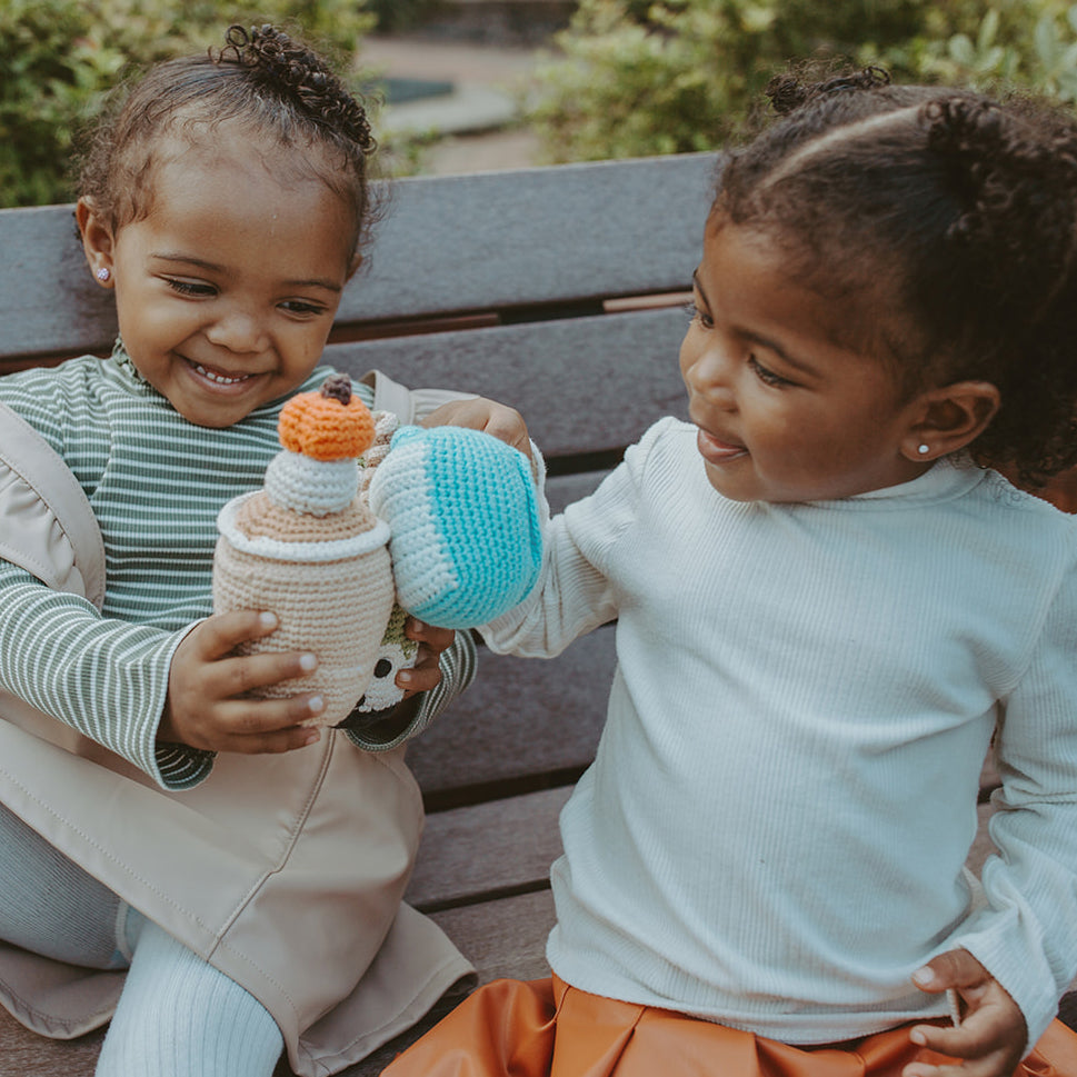 Inspire fall parties with this adorable plush cup of Pumpkin Spice! Designed for little hands to hold, this baby toy is sure to bring hours of pretend play. The rattle inside gives a very soft sound when shaken.