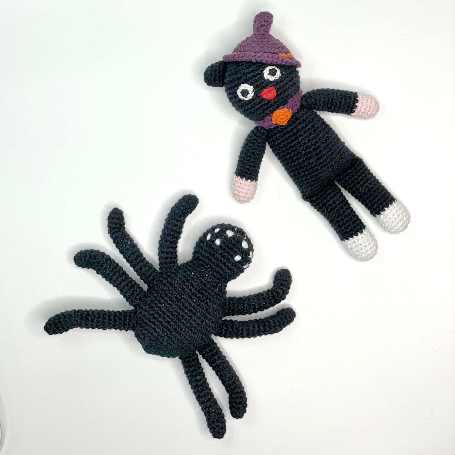 This sweet little black cat stuffed animal is ready for hours of endless play. Handmade with soft cotton yarn, the rattle inside this baby toy gives a small jingle when shaken. Perfect for baby's 1st Halloween.