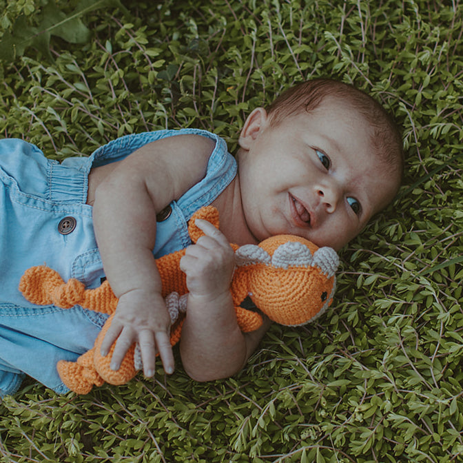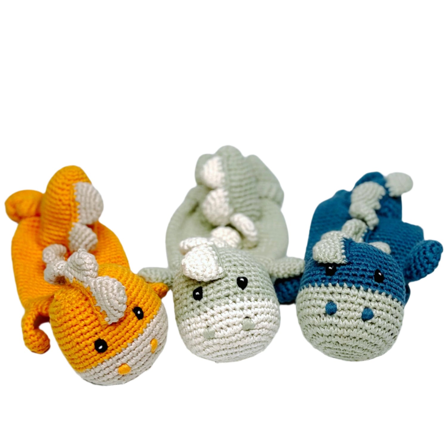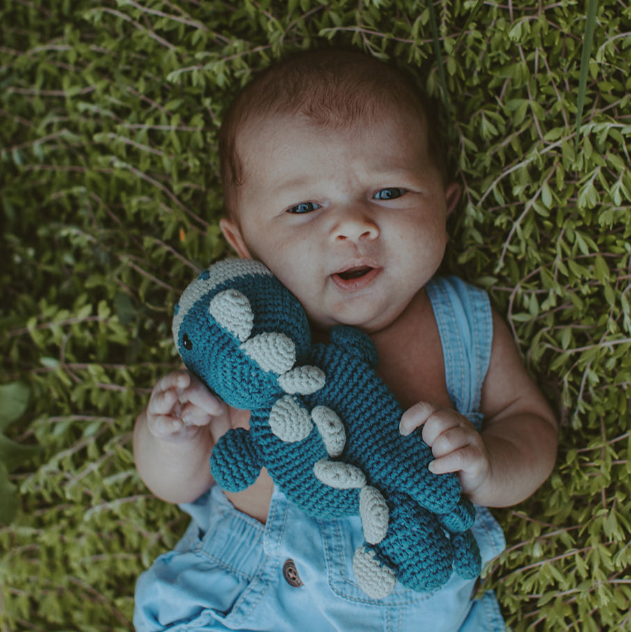 These sweet dinosaur lovies are perfect for baby's tiny hands to grab and hold close. The flat body is soft and soothing for tiny fingers. Handmade with organic cotton yarn, these adorable baby toys are designed to bring comfort to your littlest shoppers.