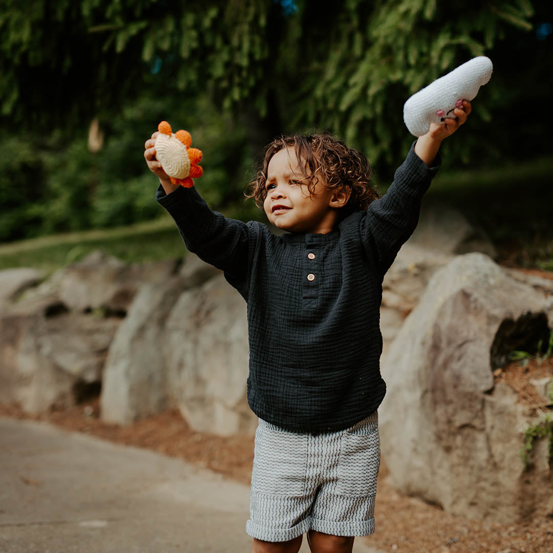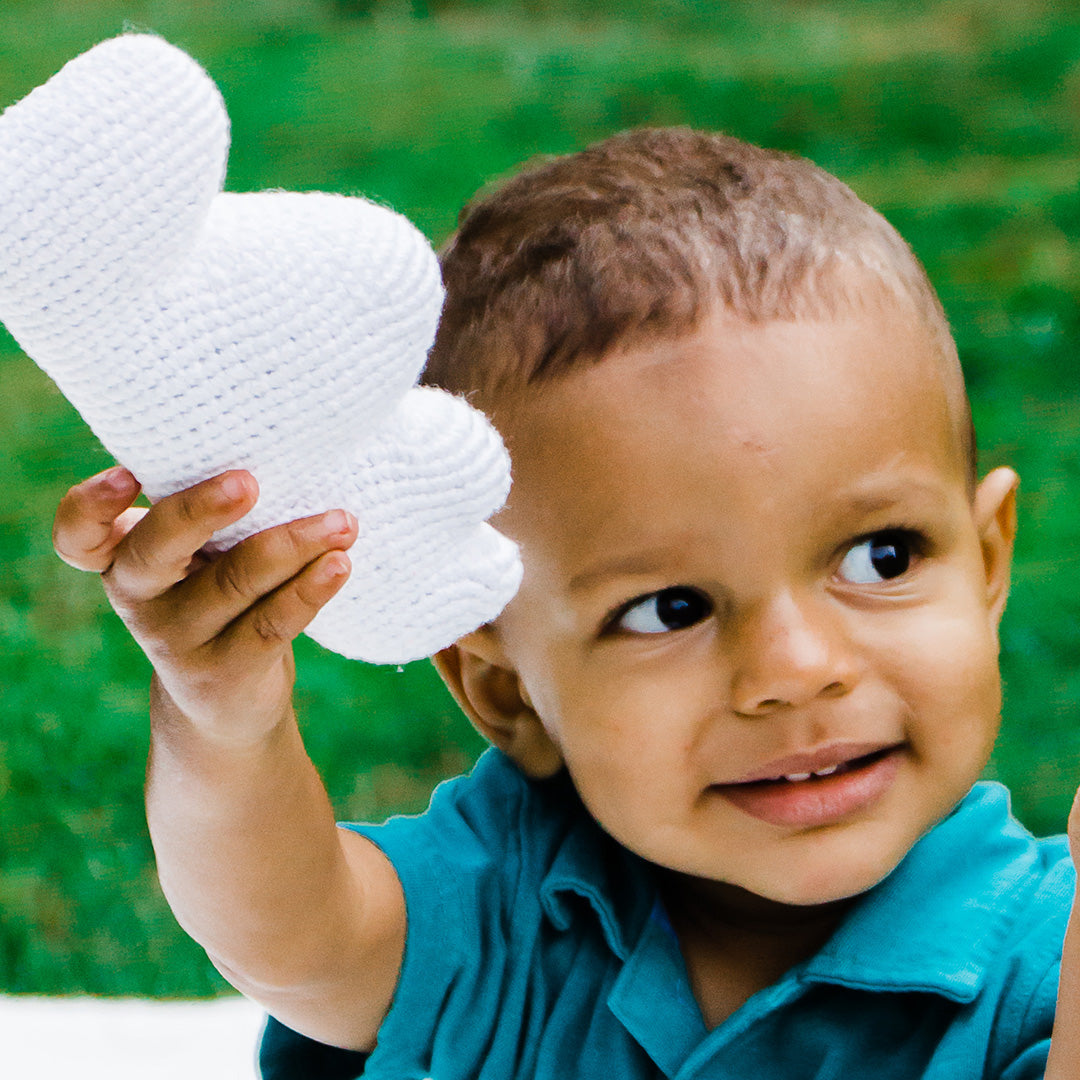Our friendly white cloud rattle is just waiting to float into your child's life. Complete with pink cheeks and a playful smile, he is the friendliest cloud you will meet. Handmade with soft cotton yarn, the rattle inside this plush baby toy makes a gentle sound when shaken, making it perfect for hours of pretend play.