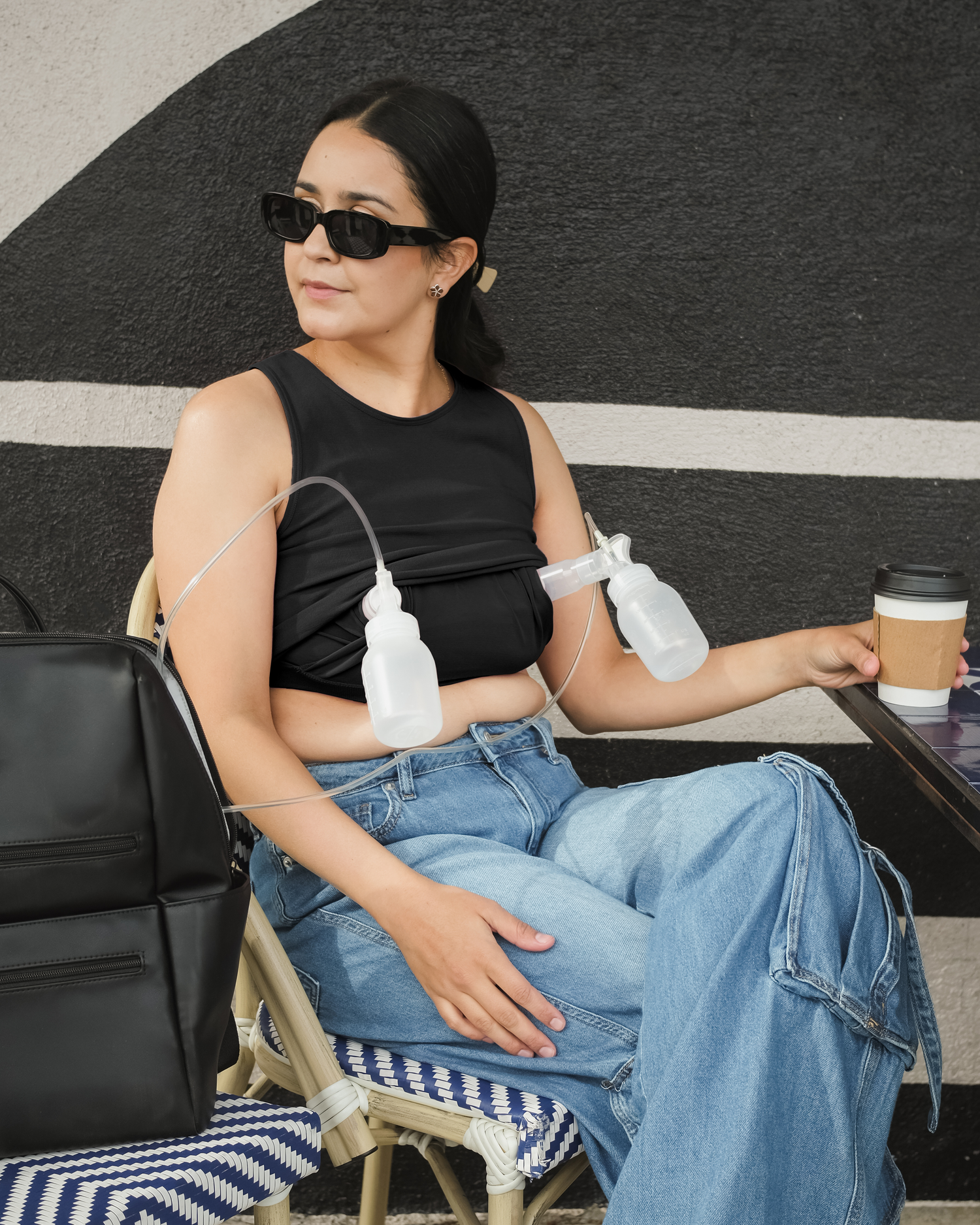 We heard you. Meet the pumping version of the Nursing Longline Bra Top you’ve been obsessed with – proof that pumping clothes can be comfortable, functional, and totally adorable. This hands-free pumping bra top features a flattering fit, ultra-soft bamboo fabric, and built-in pumping functionality. Perfect on its own or layered and great for lounging, doing yoga, or running errands, this seamless bra top keeps you comfy while making pumping convenient. No need to change bras or clip and unclip – just lift the outer layer, and slide your flanges through the openings in the inner layer. A pumping bra top that gets the job done while looking great.