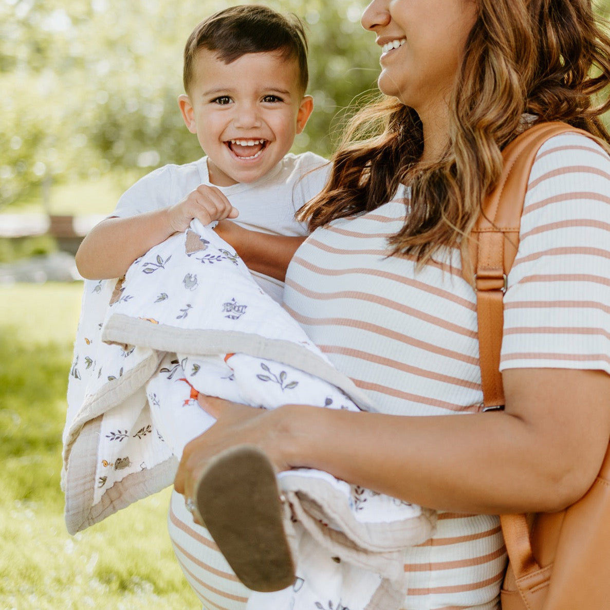 Say hello to our Baby Quilt, certain to be a favorite in your little one's blanket collection. Made from multi-layered 100% cotton muslin, it's just as durable as it is soft, cozy and breathable. Perfectly sized for snuggles, tummy time or on-the-go in your favorite stroller or jogger. Printed on both sides with our signature artwork for a beautiful touch to any nursery, and as a perfect shower gift.