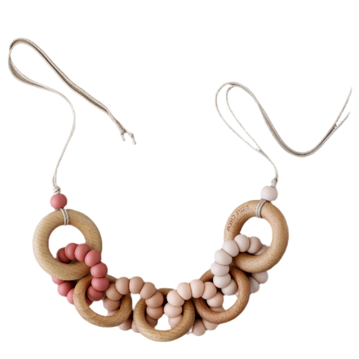 A mixture of natural beechwood rings and silicone, this garland is designed to help infants develop their motor skills, motivate them to grab on it, and experiment with the movement.