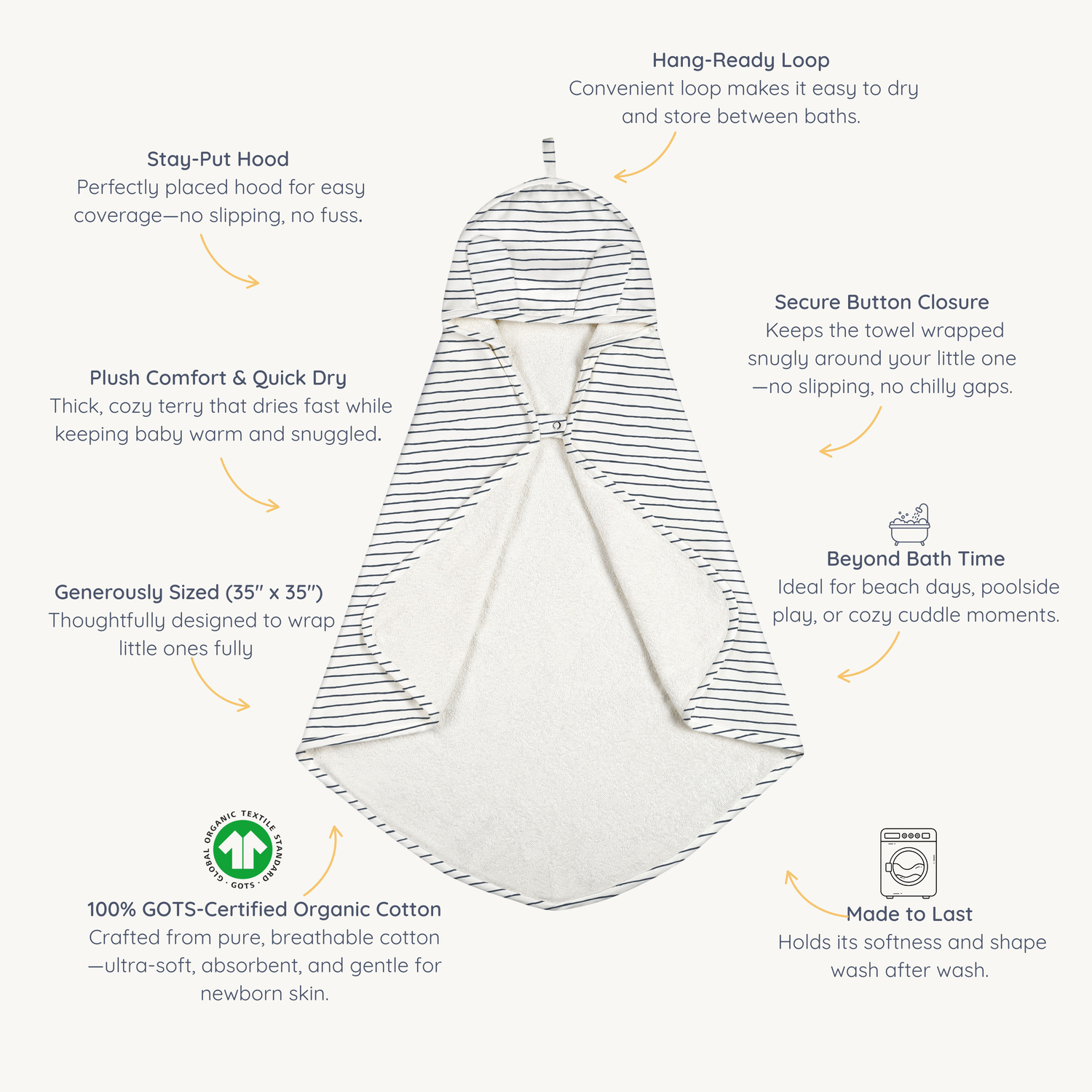 Wrap little ones up nice and snug with this soft and luxuriously fluffy eco-friendly organic cotton hooded bath towel. Every last design detail was considered for a joyous bath time, from the playful stripes on the hood & border to the matching hanging loop, we love. Super size super nice - this hooded towel covers the baby & toddler from head to toe. Woven with purest non toxic organic cotton for an incredibly smooth texture. It’s super plush and absorbent, with a lofty weight that doesn’t feel bulky.