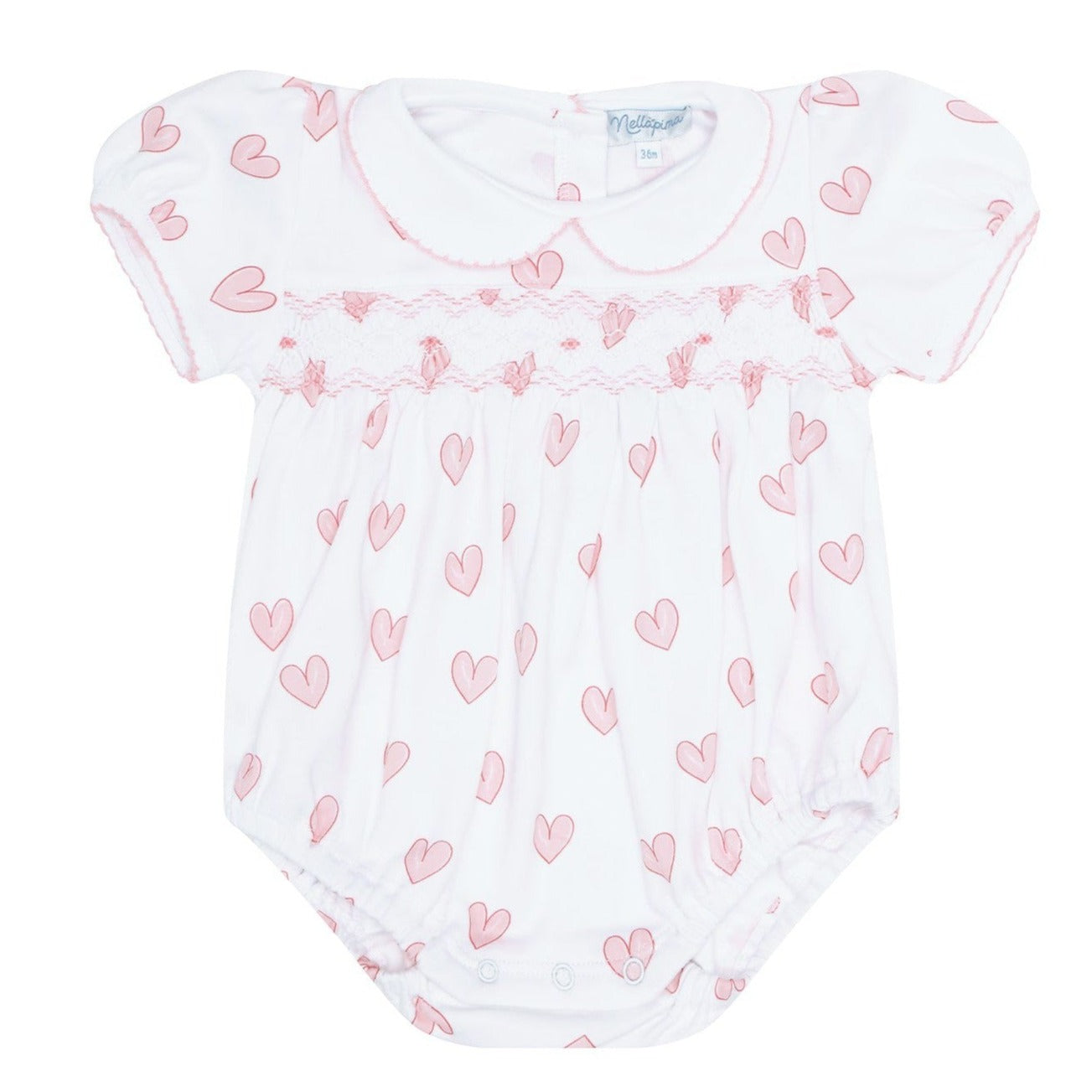 Our 100% Pima Cotton Pink Heart Print Smocked Bubble is designed to bring a touch of sweetness, charm, and friendliness to your baby's wardrobe. Available in sizes ranging from 0 to 18 months, this smocked bubble is crafted with love and care to ensure utmost comfort and irresistible style.