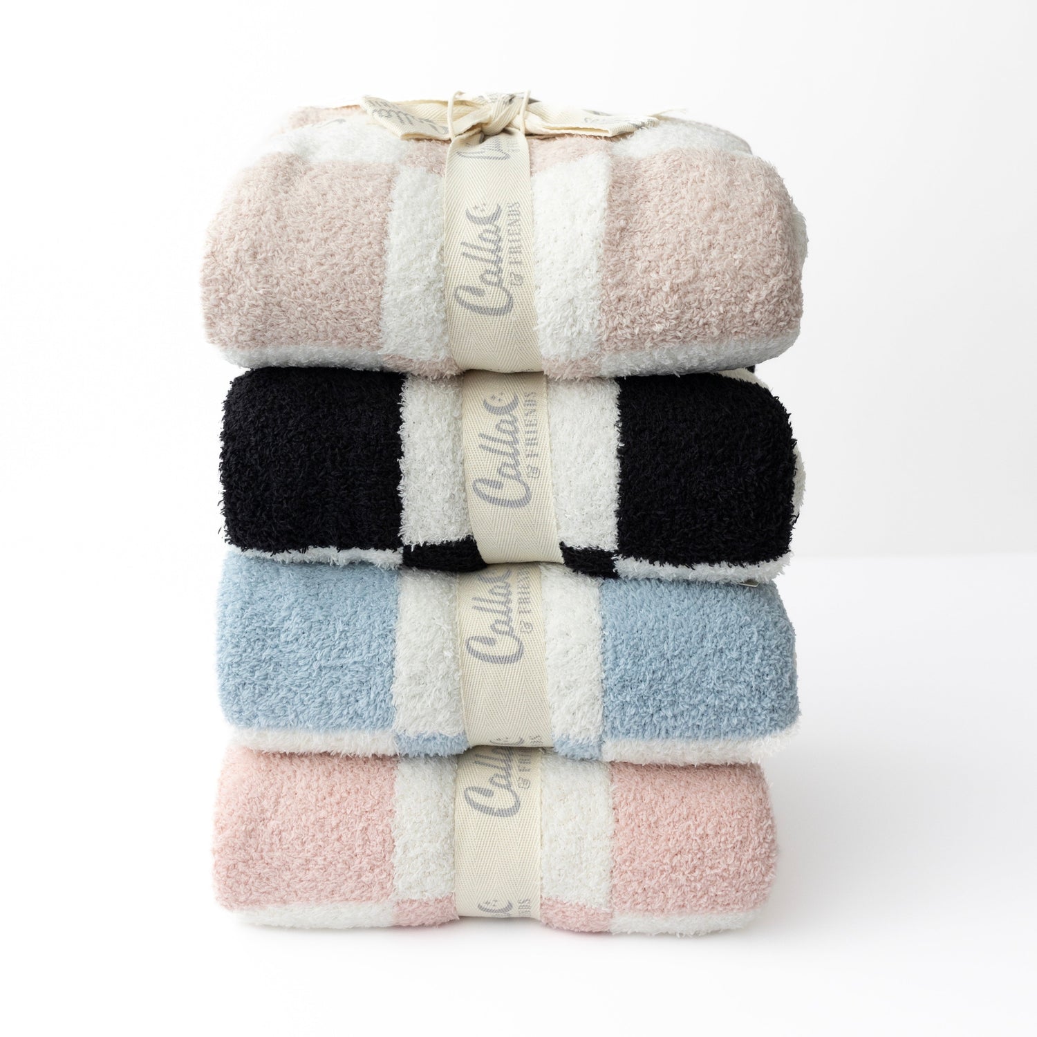 Made from the same ultra-soft material as our original Bliss Blanket, this pint-sized version features our signature checkered print and comes in four timeless colors: classic black, neutral fawn, powder blue, and petal pink.
