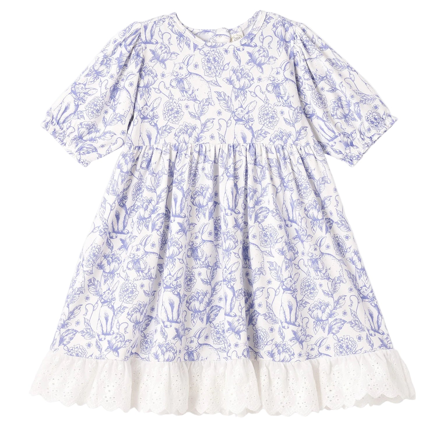 She'll celebrate Easter in the sweetest way with this darling bunny print dress! Soft blue bunnies on a creamy white background, complete with a 100% cotton eyelet lace ruffle for extra flair at the hem. Stylish puff sleeves and charming back buttons give it a sweet, timeless look. Made from an ultra-soft bamboo/cotton/spandex blend jersey, she’ll stay comfy while looking adorable for all her Easter fun. Hypoallergenic, absorbent, and eco-friendly—perfect for egg hunts and springtime adventures! Easy care: machine wash warm, tumble dry low.