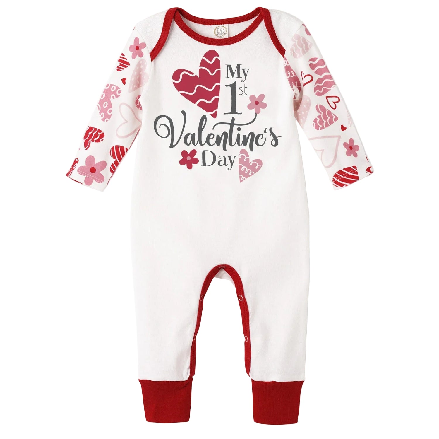 A sweet long-sleeved romper with "My 1st Valentine's Day" front graphic. Made from a comfy blend of bamboo, cotton, and spandex. Features an easy on-and-off envelope neck and snap closures. The soft and stretchy material is hypoallergenic, eco-friendly, and resistant to sweat. Simply machine wash on warm and tumble dry on low.