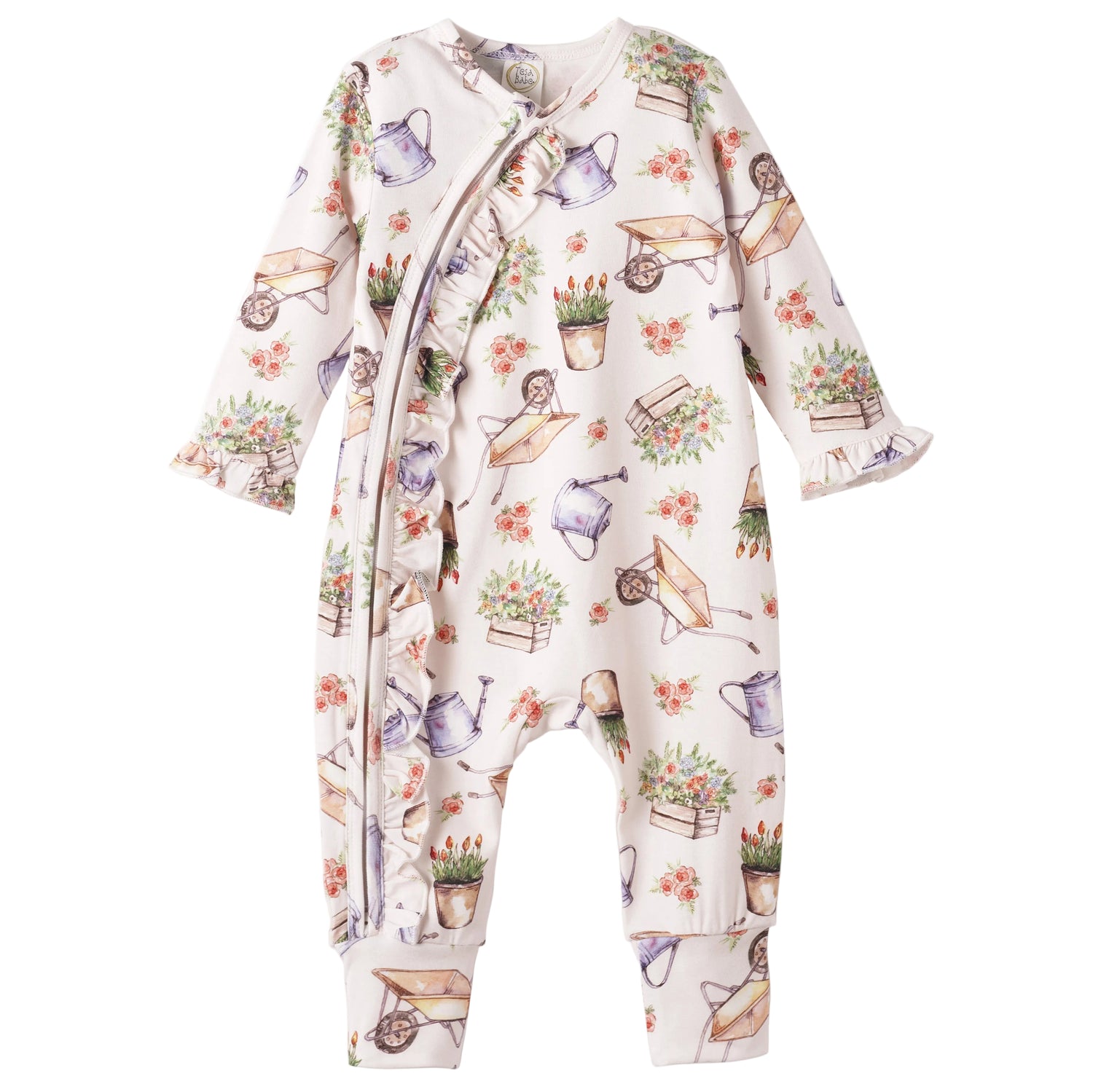 Zip into garden-day coziness with this ultra-soft romper, made from a breathable bamboo-spandex blend. Naturally absorbent, hypoallergenic, and eco-friendly, it’s perfect for delicate skin and everyday comfort. A full-length zipper with a protective neck guard makes outfit changes a breeze, while ruffle trim adds a touch of sweetness. The convertible cuffs fold over to become footies, giving growing babies extra room and year-round flexibility. 🌿
