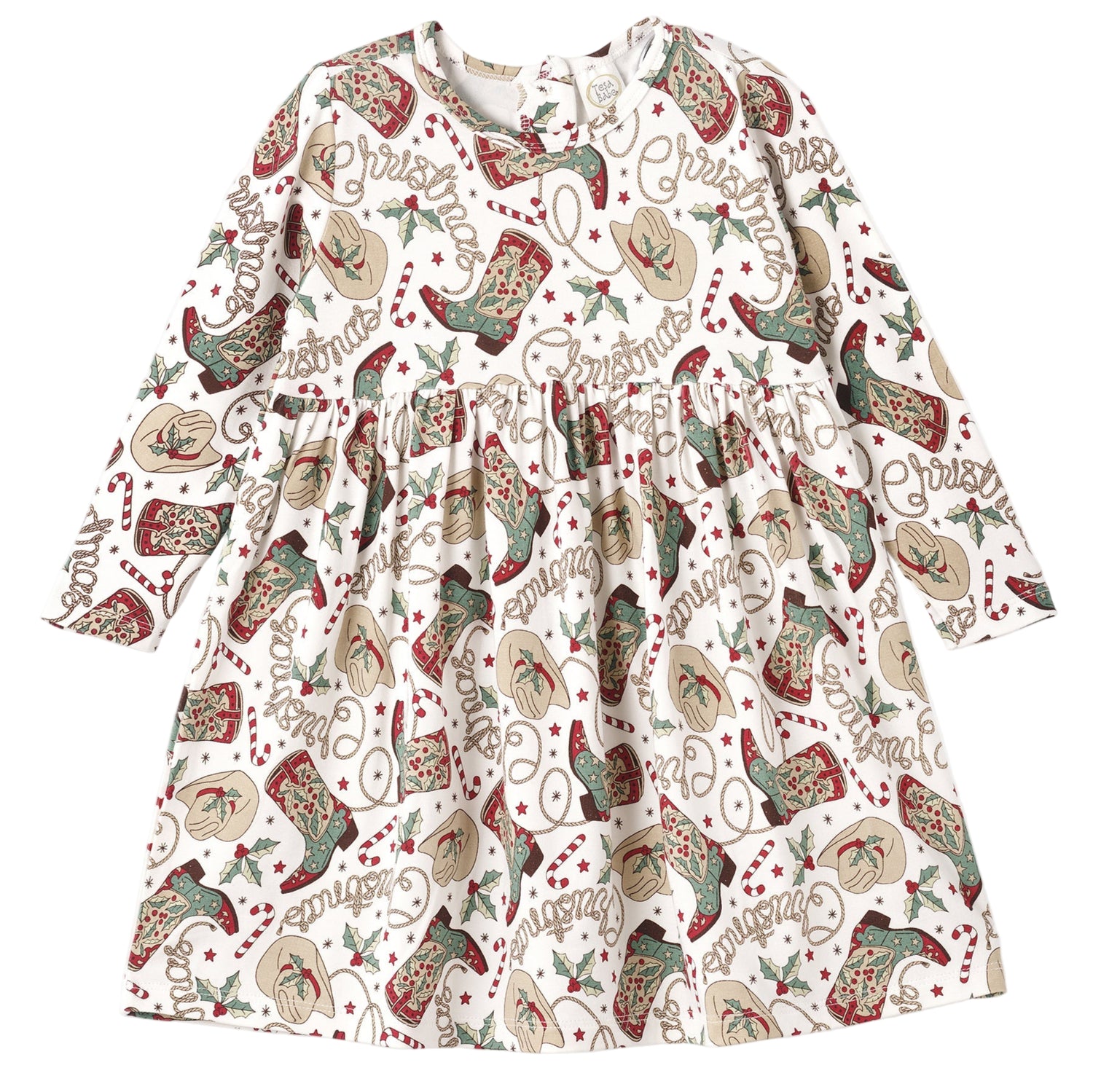This twirl-worthy Western Christmas dress is ready to wrangle up holiday joy! Made from ultra-soft bamboo-spandex jersey, it features a festive cowboy-themed print with boots, hats, candy canes, and holly. Naturally hypoallergenic, eco-friendly, and breathable, it's perfect for celebrating in comfort. Back buttons make dressing easy, while the full skirt adds seasonal flair for every little cowgirl.