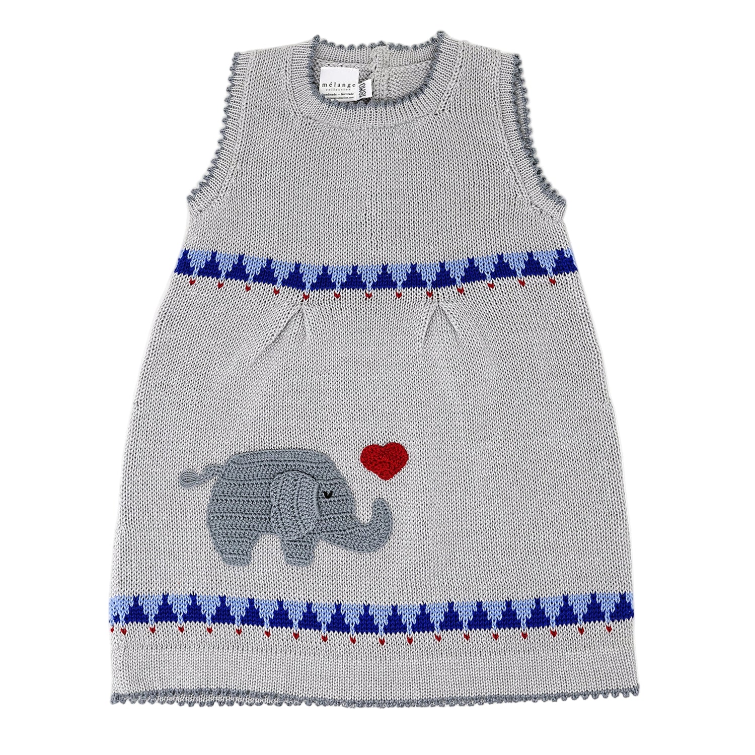 Crafted from gray yarn, this sleeveless dress features a sweet hand-stitched elephant blowing a heart, complemented by playful blue and red detailing along the hem and chest. The scalloped trim adds a touch of elegance to this timeless piece.
