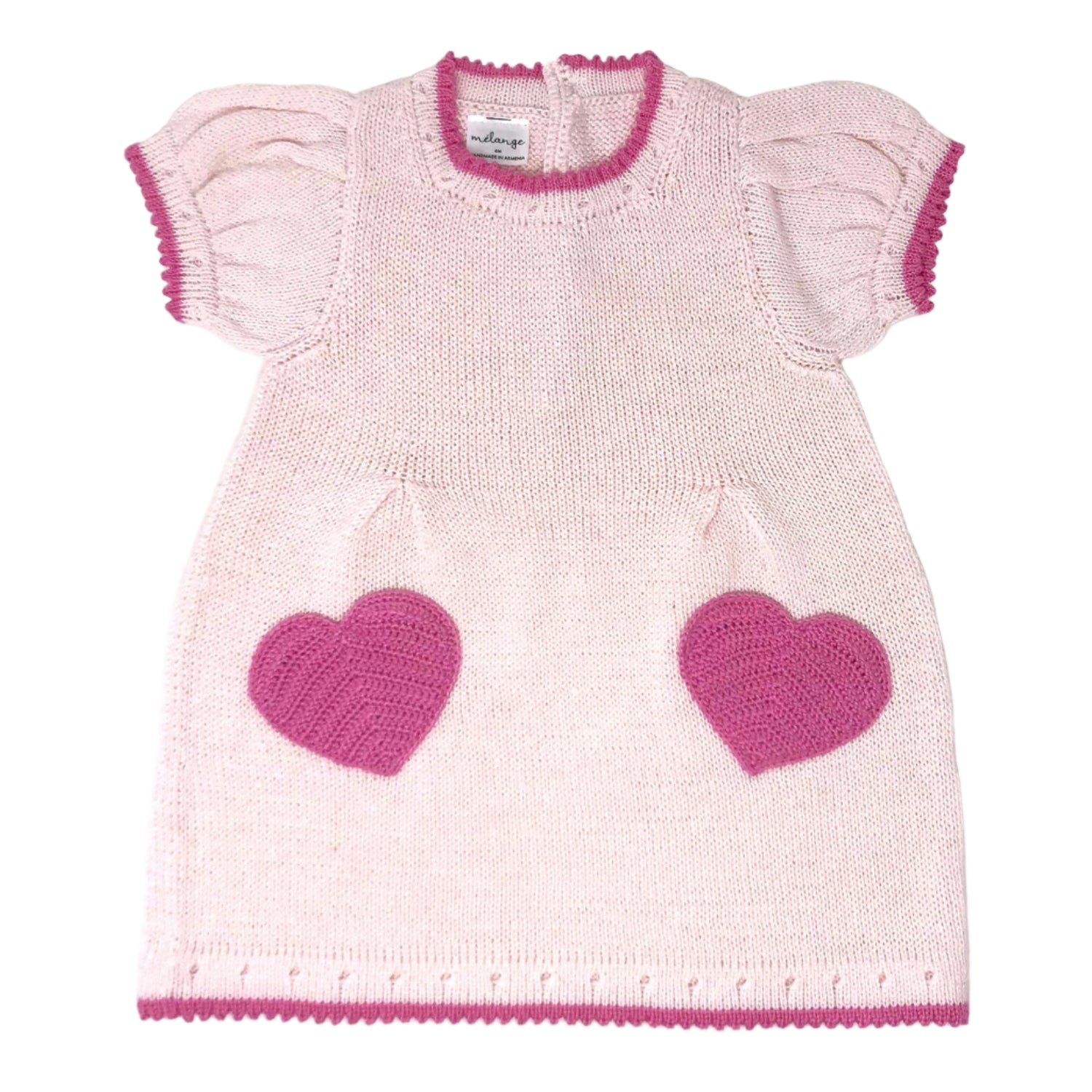 Two festive hearts make fun pockets. Perfect dress for your little Valentine! This dress also matches the pink Valentine baby hat.