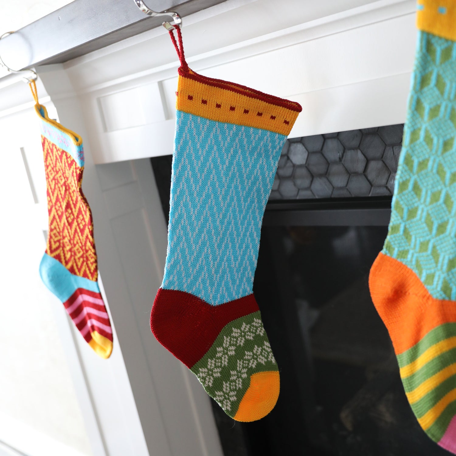 Bring a vibrant and joyful touch to your holiday décor with this colorful knit holiday stocking. The stocking features a lively blue herringbone pattern that creates a striking visual appeal, contrasted beautifully by a rich yellow cuff adorned with red accents. The heel and toe add even more character with a combination of red, green, and yellow, each section displaying its unique pattern for a playful and eclectic design.