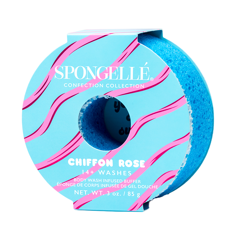 Get ready for a delectable bathing experience. Caress your skin in Spongellé’s Confection Collection in Chiffon Rose, our playful and creamy blend of triple whipped butter and sweet sugarcane extracts. Chiffon Rose echoes nostalgic feelings of bliss with sexy Damask rose, cozy sugared vanilla, and sultry whipped musk. Our fun donut-shaped cleansing buffer gently exfoliates dead skin for deliciously soft skin and nourishes for 14+ decadent showers.