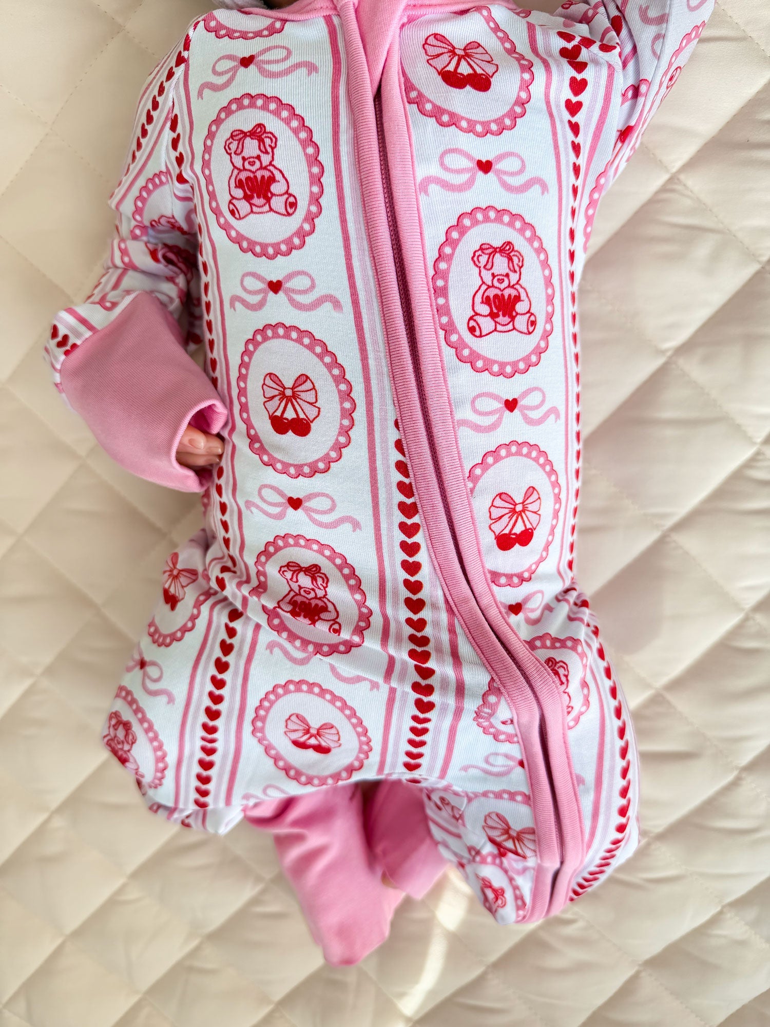 Bamboo Zip Romper | Cherry Bear - 0-3M is backordered and will ship as soon as it is back in stock.
