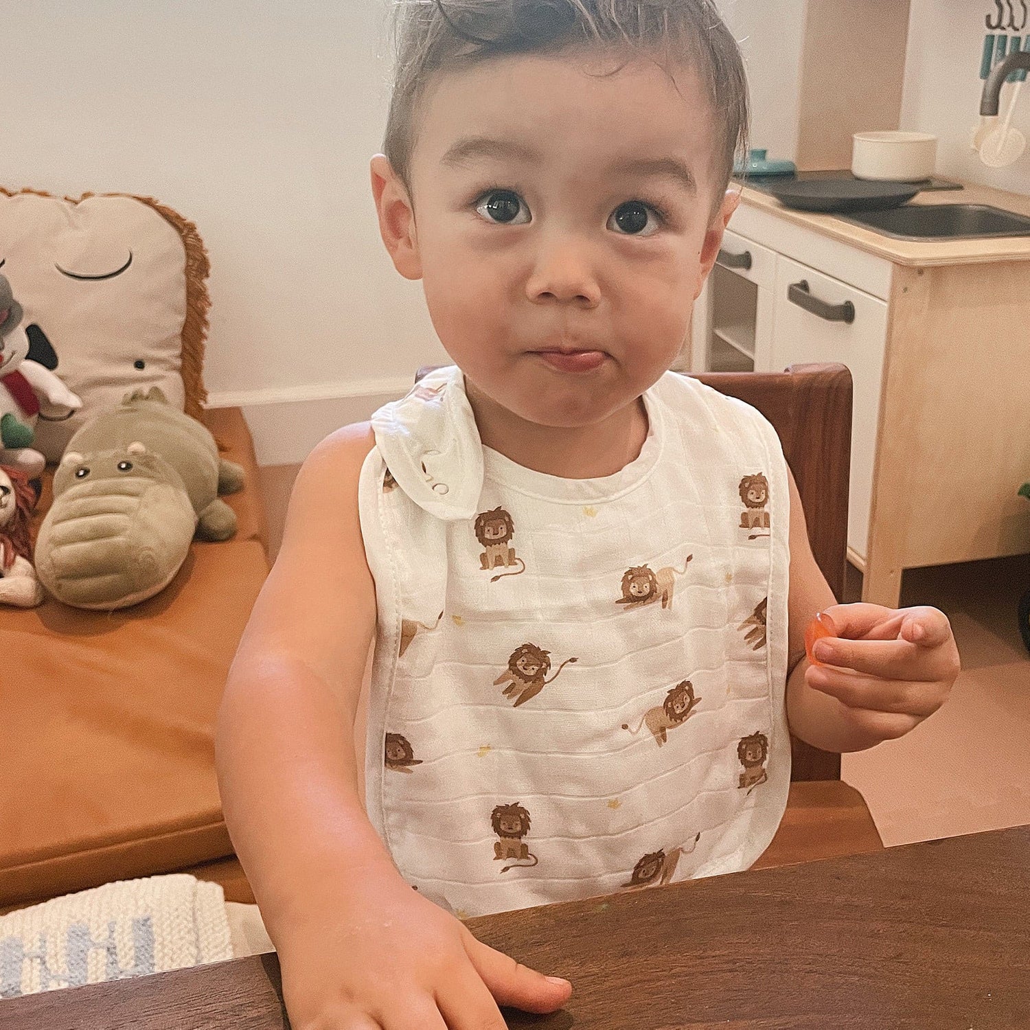 Our versatile, pillowy soft bamboo baby bibs are perfect companions for eating, teething, or even drooling. The two-sided blend of viscose from bamboo with cotton muslin on front and absorbent, plush terry backing is tough enough to hold up to any spills, sustainable enough to set your mind at ease, and so comfortable your child will forget they’re wearing it!