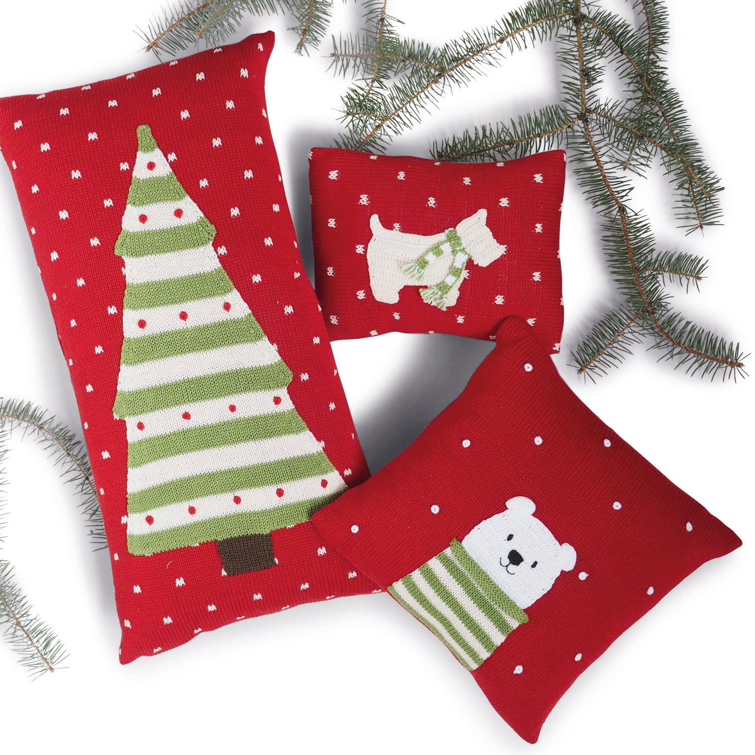 This knit holiday throw pillow brings a touch of festive cheer to your home with its charming Christmas tree design. The pillow features a beautifully striped tree, adorned with red accents, set against a rich red background sprinkled with delicate white dots, reminiscent of falling snow.
