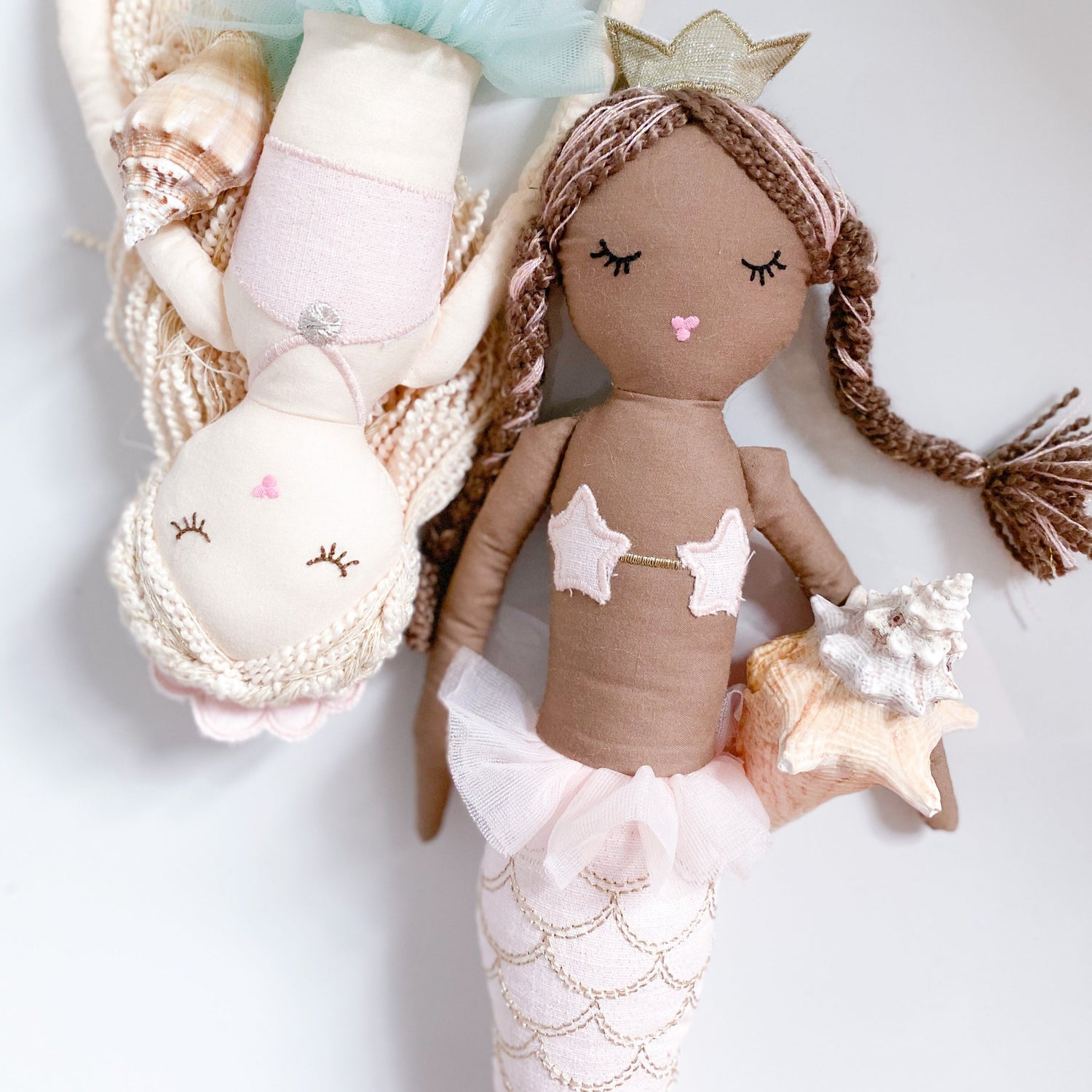 Macie the magical mermaid doll has popped up from the ocean to make some human friends! Her beautifully embroidered golden scales shimmer in the sun, while her sparkle crown adorns her head of yarn hair. This mermaid doll also bends at the waist, so she is able to sit...perfect for pretend play or shelf decor.
