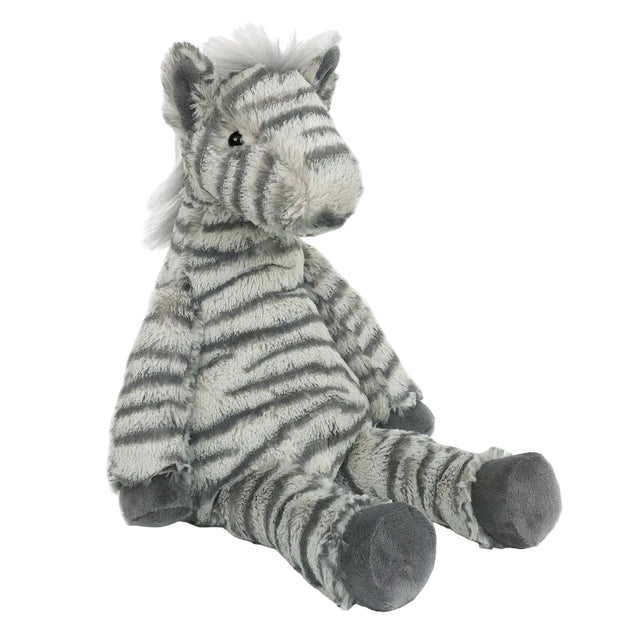 Introducing Zanzibar the Zebra, your adventurous new companion ready to leap from the playground to cozy cuddle sessions! Zanzibar's delightful dark and light grey stripes make him not only undeniably adorable but also a beautifully designed reminder of a real zebra. With a silky soft faux fur mane, a fluffy tufted tail, and a nuzzly soft grey fur muzzle, Zanzibar is irresistibly cuddly. His bold stripes are sure to catch your eye, while his slouchy, weighted bottom design ensures hours of imaginative play and relaxation. As you hold Zanzibar close, let his soulful dark eyes and expressive ears work their magic. This exotic safari sweetheart is all about big hugs, so get ready for warm embraces.