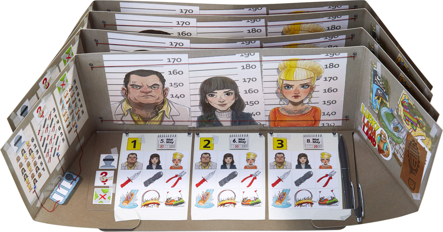 A series of sabotages has shocked Lucky Llama Land! Multiple attractions at the theme park were tampered with. Players start their investigations and combine clues about the days of the crimes, perpetrators, tools, and crime scenes. They need to generate the right number code and use the key to put the saboteurs behind bars. In the end, it’s not necessarily the fastest investigator who wins the game, but the most efficient one.