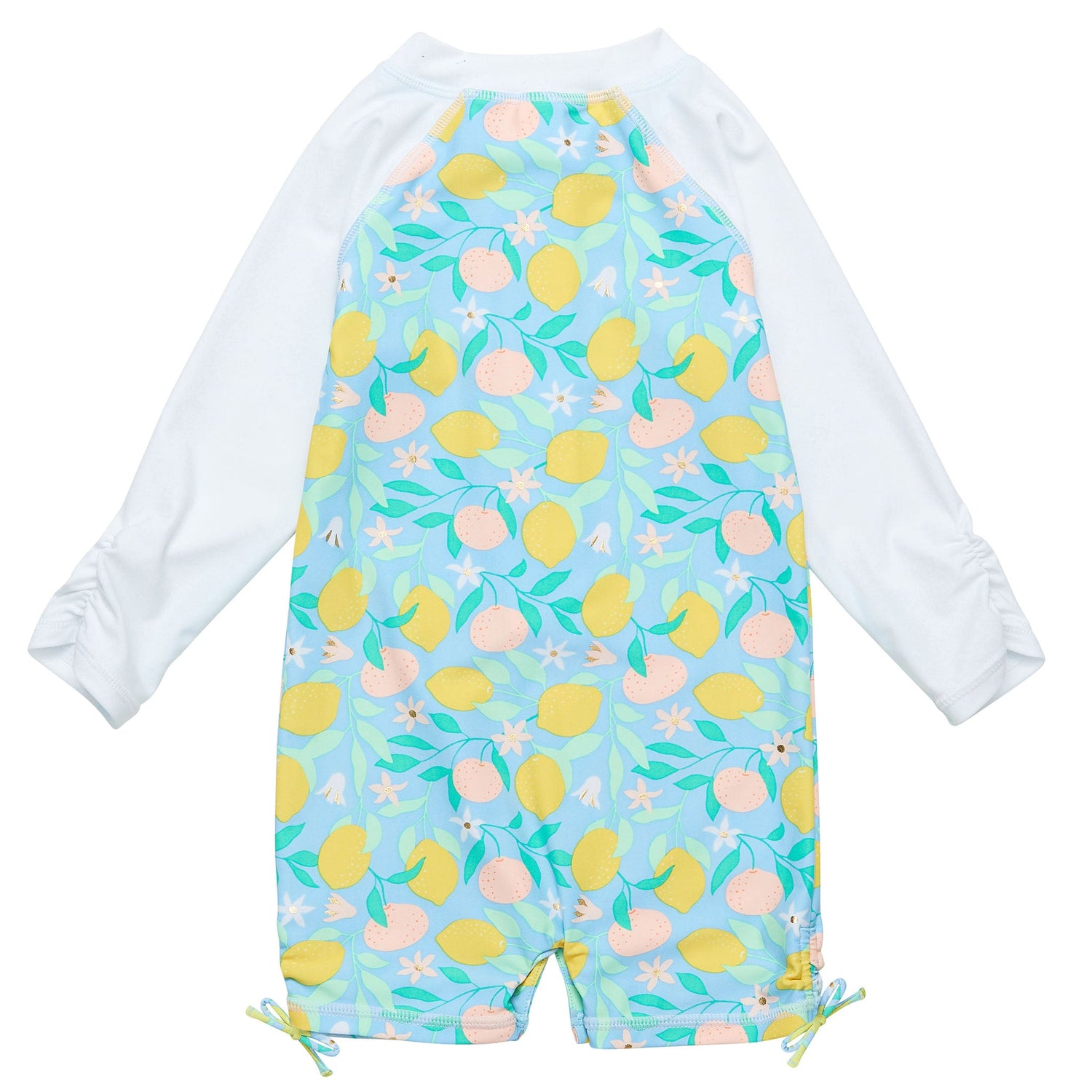Let your little darling shine as bright as the sun while also being protected from its harmful rays in our UPF50+ certified Lemon Drop long-sleeved sunsuit. With ruching on the bright white sleeves, an easy-to-use zipper, and pull ties at the hems, it will keep her comfy and cheerful all day long.