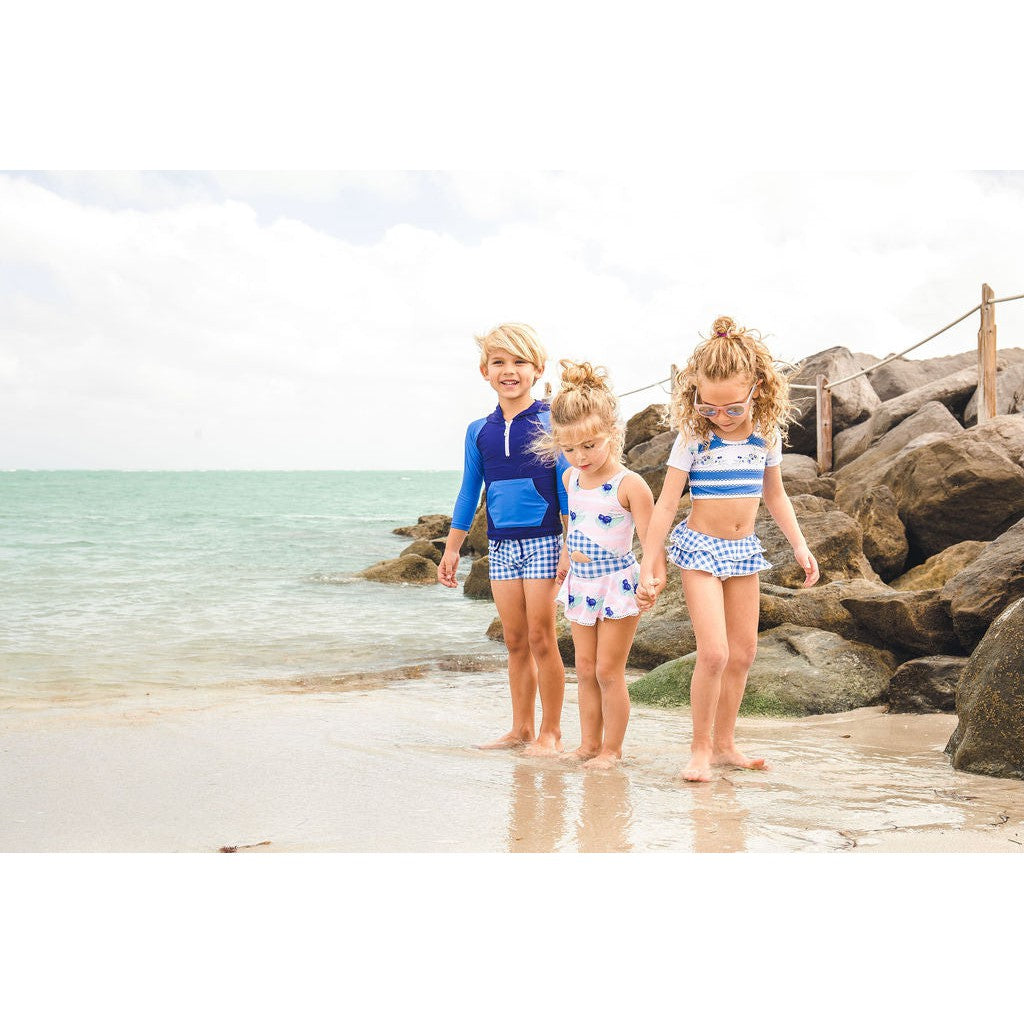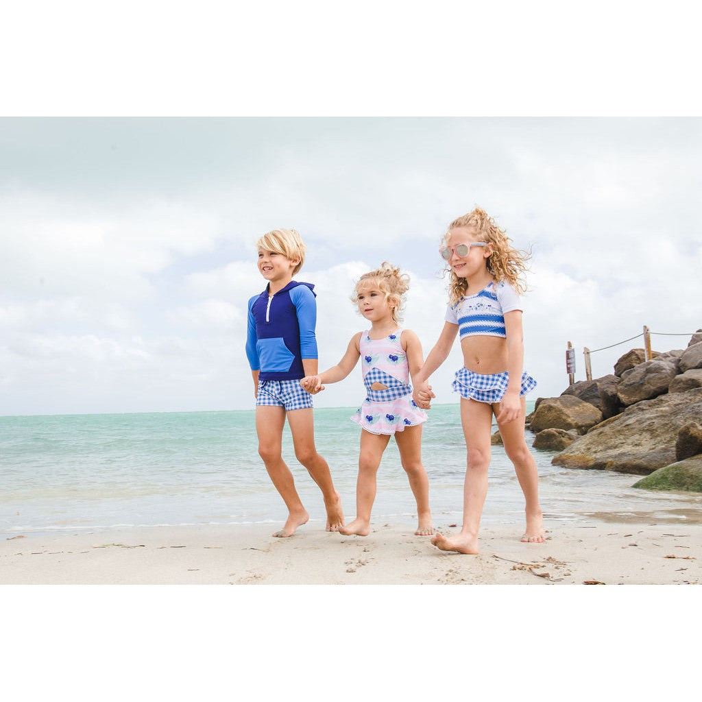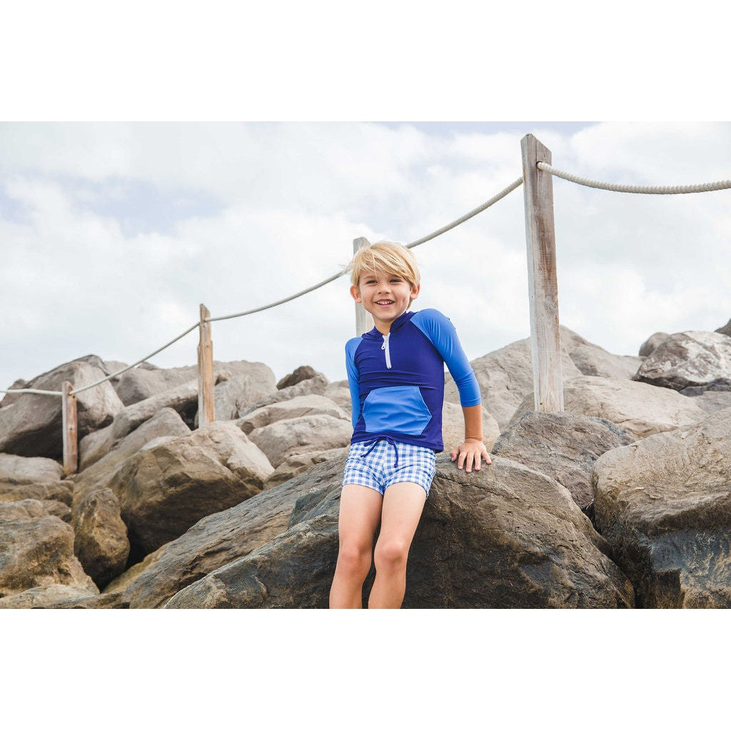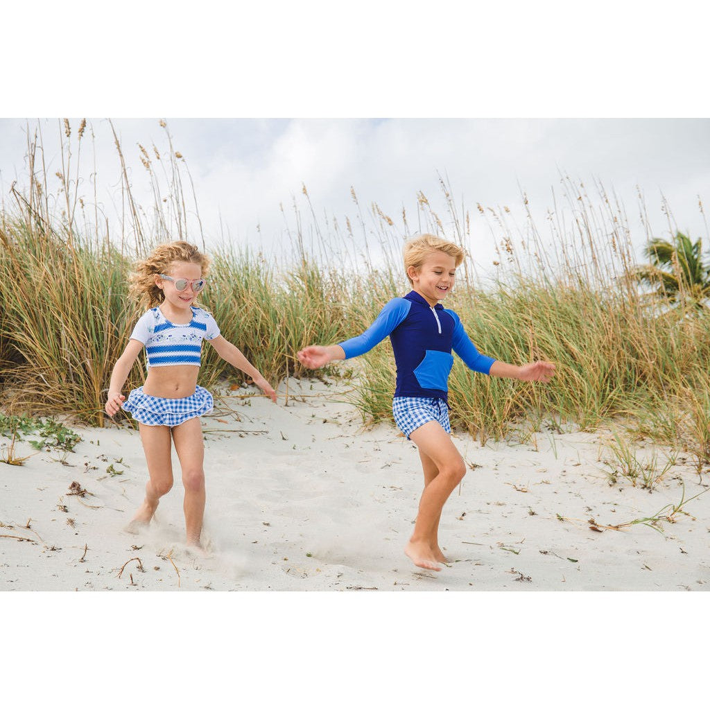 Print: The swim briefs are made with our classic, signature blue and white check fabric which coordinates with many of our girl styles. The contrast colored drawstring brings in a pop of navy blue.