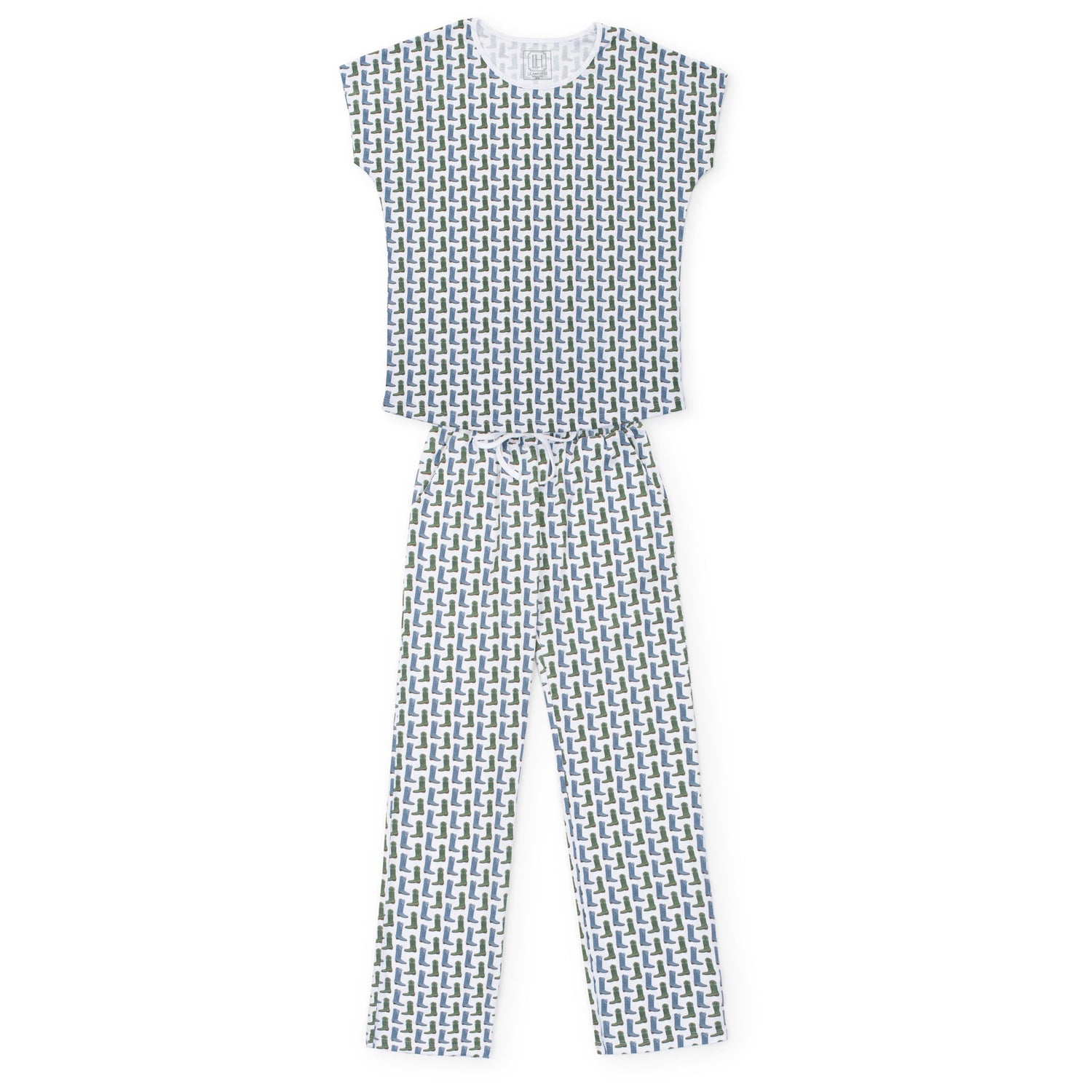 Women's pima short sleeve top with matching lounge pants. Pants have a waistband with a drawstring and hit just above the ankles.