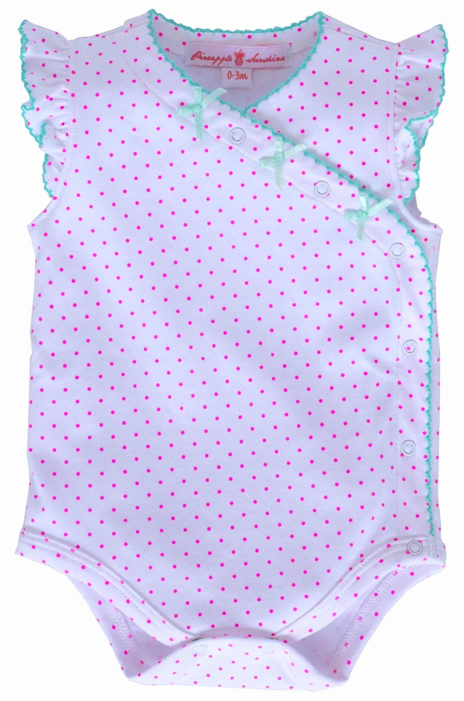 Nothing cuter than hot pink polka dots and bright aqua bows! Made from 100% pima cotton, our Ava Onesie is definitely a favorite!