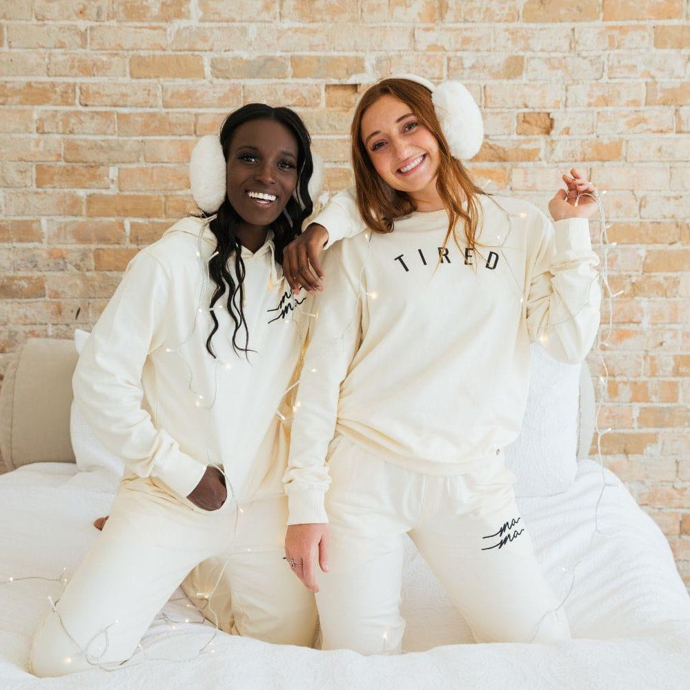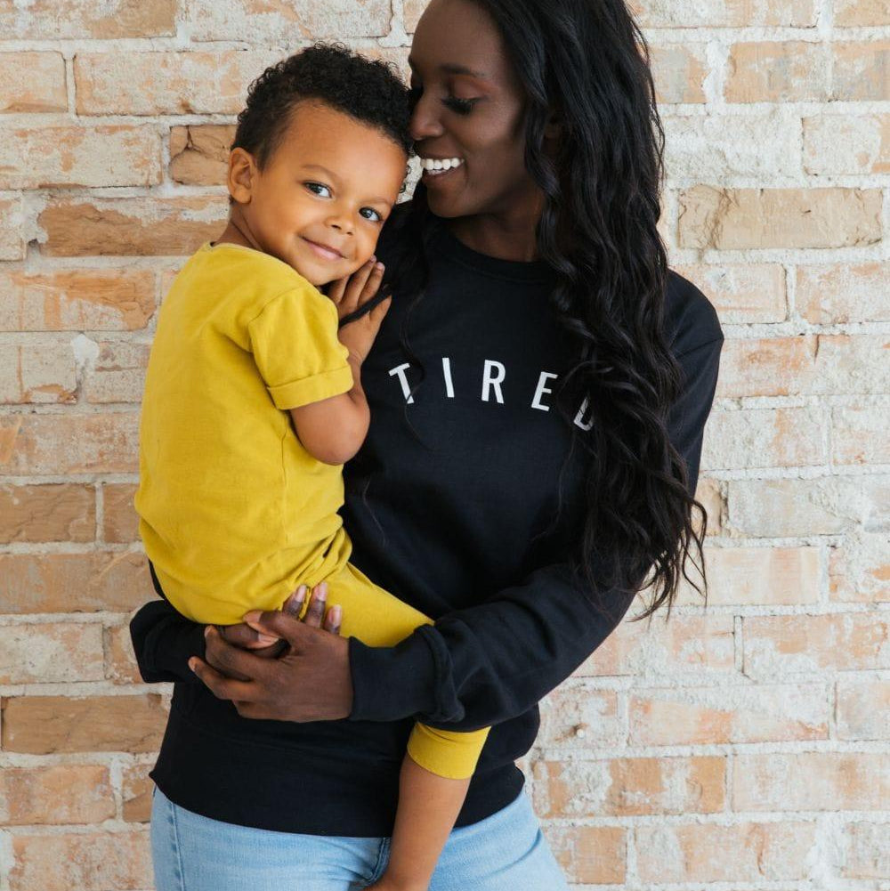 Zzzzz! The TIRED Sweatshirt is a playful homage to the pure exhaustion we sometimes feel in motherhood. We are so thankful for our babe(s) - yes! - and we are also... so tired! Nighttime wake ups, early mornings, nonstop to-do's... we find ourselves yawning throughout the day more than ever before. May as well be cozy while conquering the day as the amazing mom you are! Made with high quality, buttery soft fabric on the outside and a brushed fleece on the inside, this sweatshirt is like a warm hug from your mama bestie. As ALWAYS, the tags inside have an uplifting mama message that serve as a little pick-me-up when you throw it on.