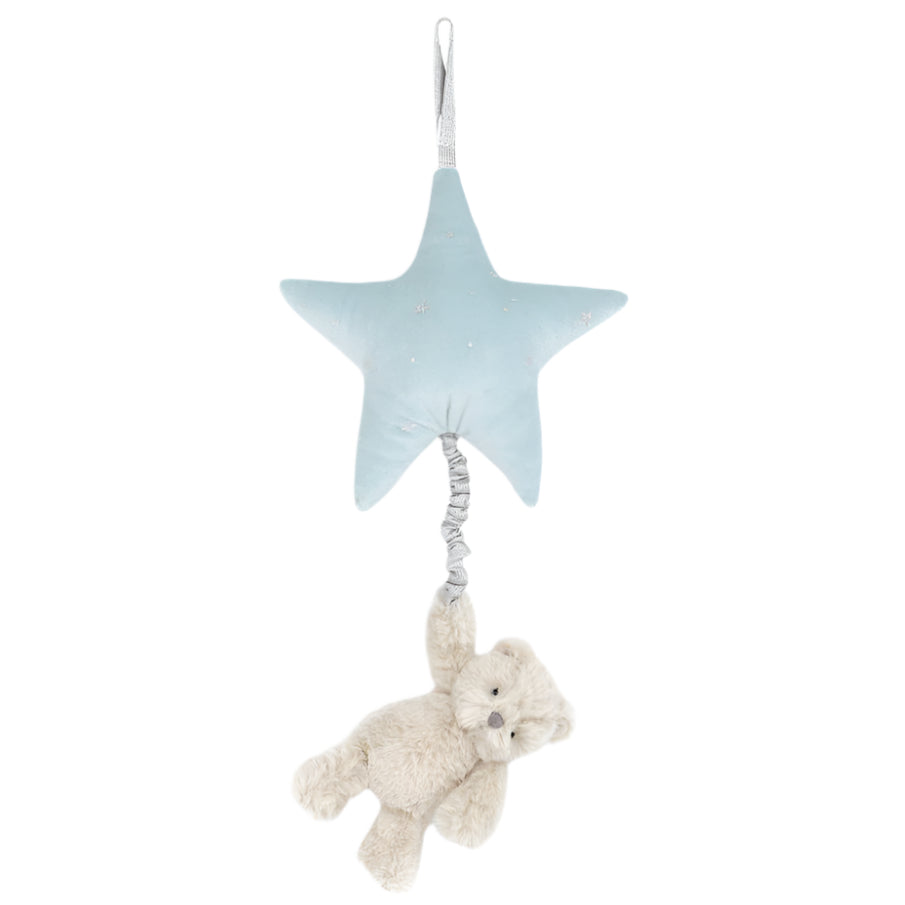 Give the gift of sweet dreams with our enchanting Bear Music Mobile! This cuddly little bear, with its soft fur and gentle Brahms lullaby, is ready to whisk babies off to dreamland. Just give the plush bear a gentle tug, and let the soothing melody work its magic. The blue foil printed star adds a touch of sparkle and easily attaches to cribs or strollers with a Velcro loop, bringing cozy comfort anywhere. A charming baby shower gift, it’s music to every baby‘s (and parent’s) ears!