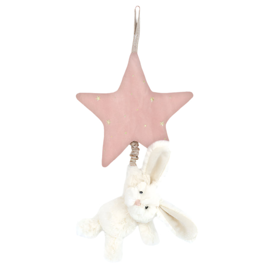 Give the gift of sweet dreams with our enchanting Bunny Music Mobile! This cuddly little bunny, with its soft fur and gentle Brahm's lullaby, is ready to whisk babies off to dreamland. Just give the plush bunny a gentle tug, and let the soothing melody work its magic. The pink foil printed star adds a touch of sparkle and easily attaches to cribs or strollers with a Velcro loop, bringing cozy comfort anywhere. A charming baby shower gift, it's music to every baby's (and parent's) ears!