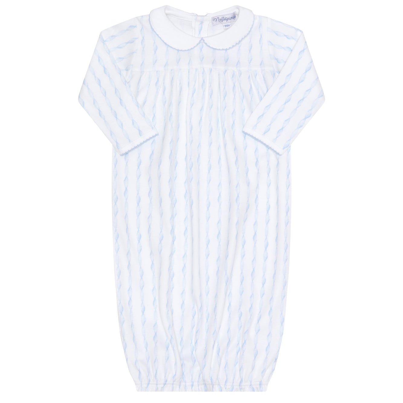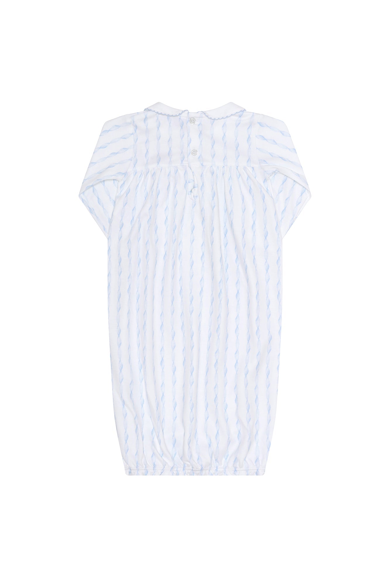 This gown features a delightful light blue twirls pattern that's perfect for keeping your baby cozy and stylish. The pristine white collar with blue picot trim, along with matching details on the wrist area, add an elegant touch to this beautiful piece.