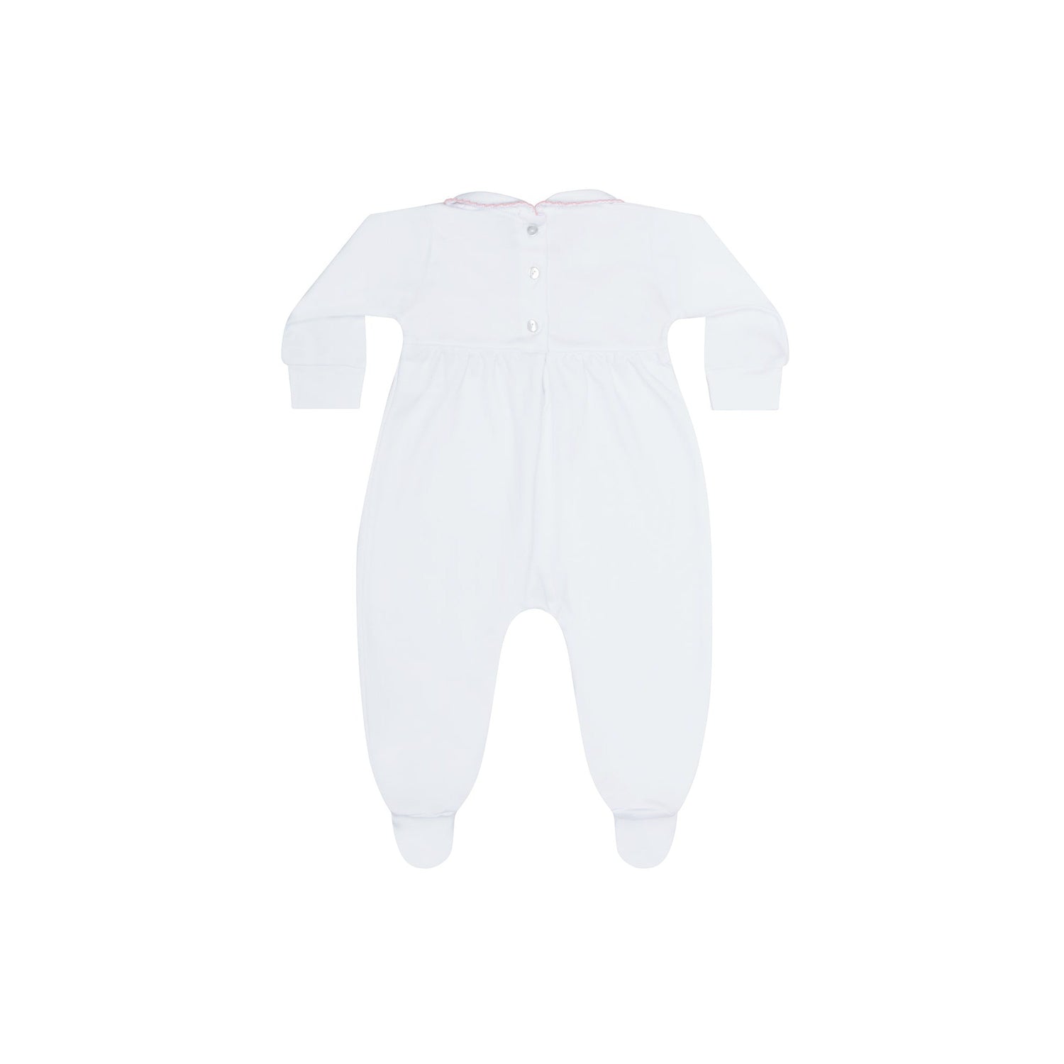 Our 100% Pima Cotton Heart Smock Footie is designed to bring a touch of sweetness, charm, and friendliness to your baby's wardrobe. This footie comes in a pristine white color adorned with pink hearts on the smock, creating an enchanting and delightful look. Available in sizes ranging from 0 to 12 months, this footie is crafted with love and care to ensure utmost comfort and irresistible style.