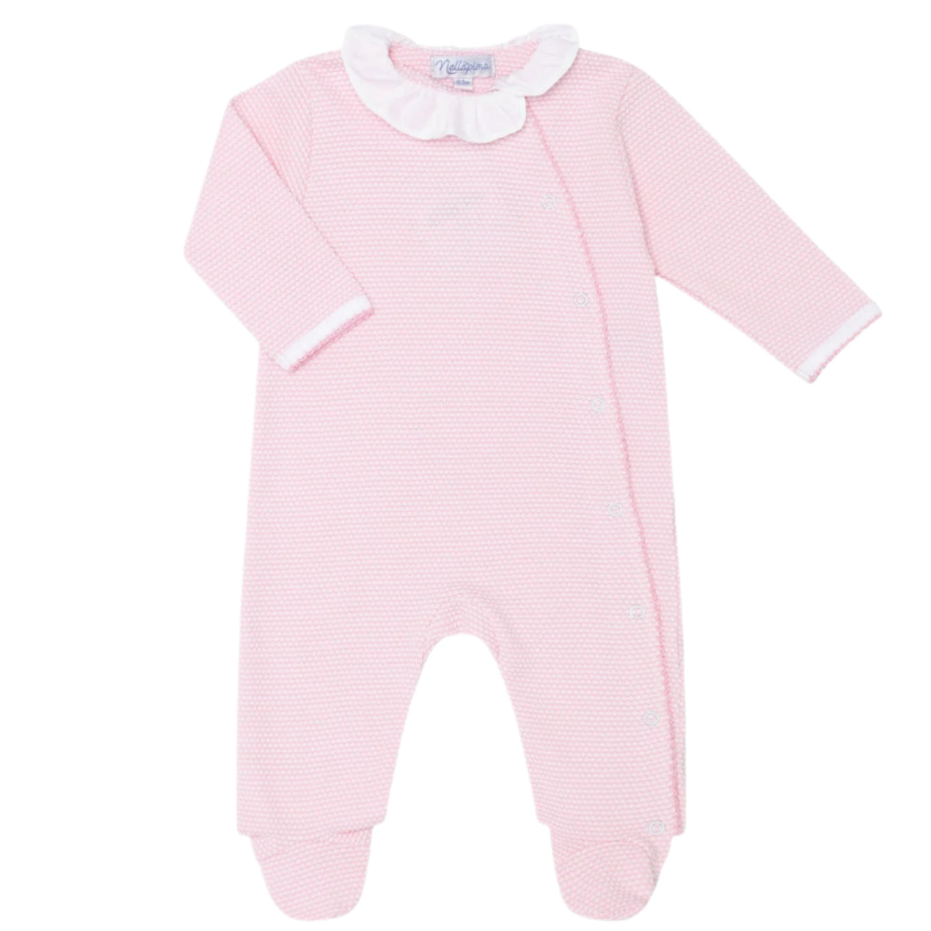 Our adorable Pink Bubble Crossover Footie combines style and comfort, all while being effortless to maintain. This footie is crafted from the finest Peruvian Pima Cotton, making it an ideal choice for babies who require extra care during their initial years. Not only is it incredibly soft and comfortable, but it also provides protection from dust and rashes while crawling and walking. Your little one can move freely and confidently in this footie, while you can rest assured knowing that they are snug and secure.
