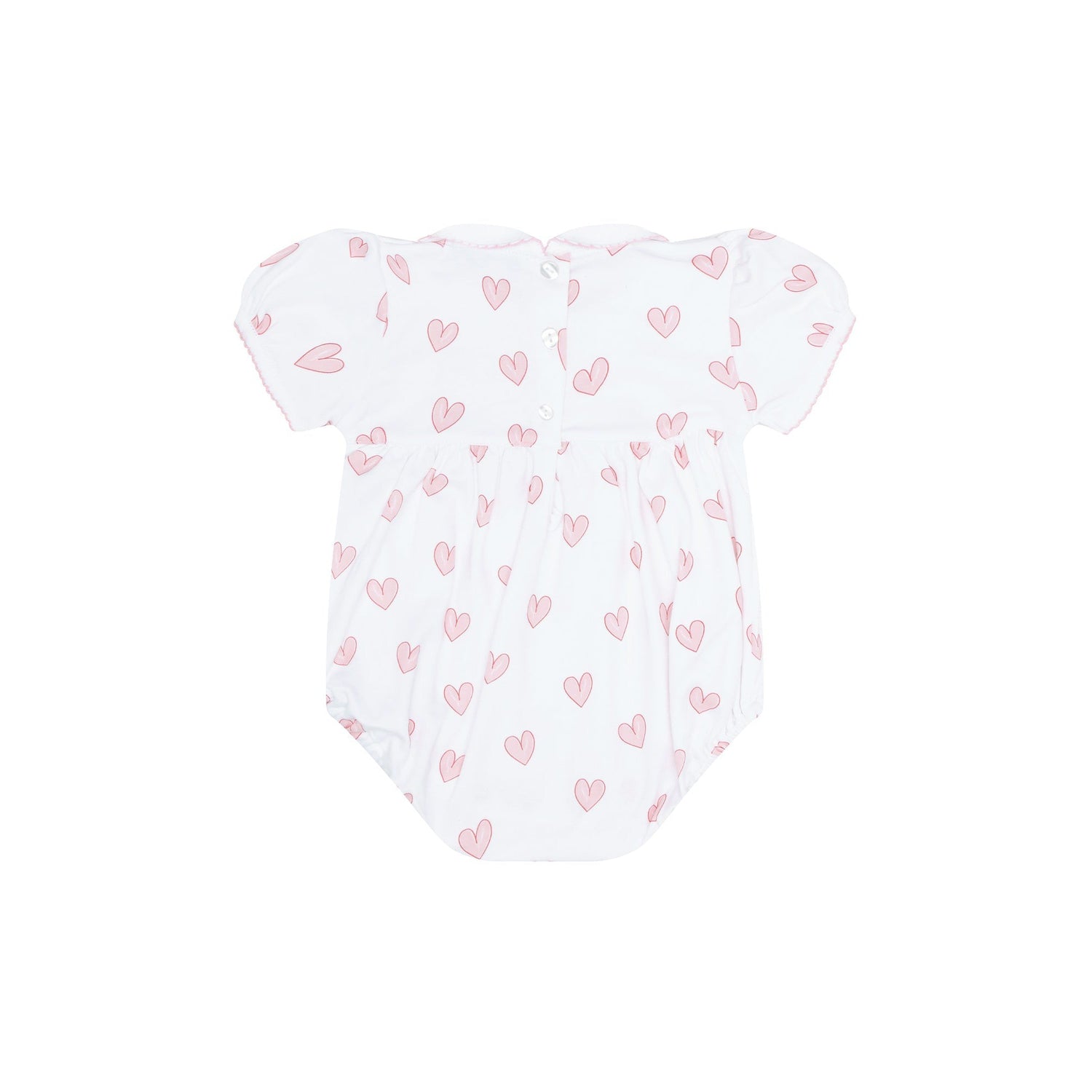 Our 100% Pima Cotton Pink Heart Print Smocked Bubble is designed to bring a touch of sweetness, charm, and friendliness to your baby's wardrobe. Available in sizes ranging from 0 to 18 months, this smocked bubble is crafted with love and care to ensure utmost comfort and irresistible style.