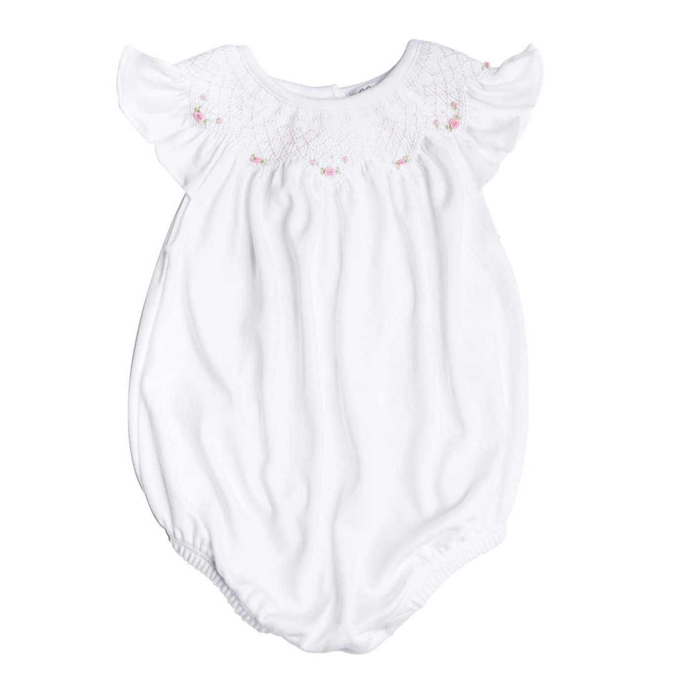 Rose smocked bubble for baby girls is perfect for any occasion. Many mom's choose this sweet bubble as it's cool and comfortable. This lovely 100% pima cotton bubble has a classic smocked collar with stitiching and roses in soft pink color. It has buttons at the back and has snap closures for easy and quick changes.