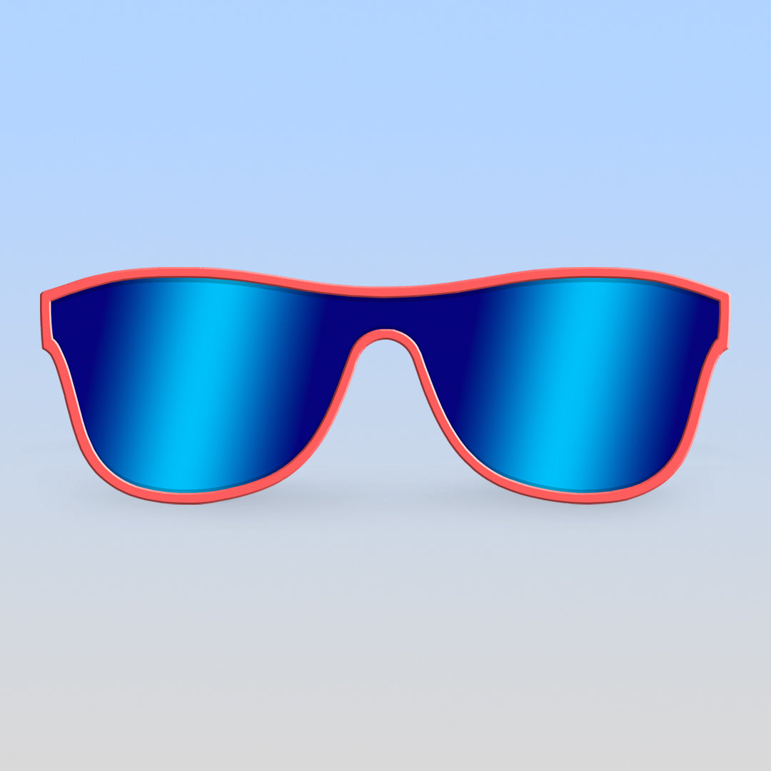 These hot pink single shield toddler sunglasses are inspired by the iconic Saved by the Bell character, Slater, with his vibrant and retro-cool style. Our Teen-Adult size fits ages 15+ depending on head size. Named after the coolest hang out of the Bayside High crew—The MaxRoshambo's newest style of sunglasses melds super-neon, fun-spirited frame colors and mirrored polarized lenses for the coolest combos!