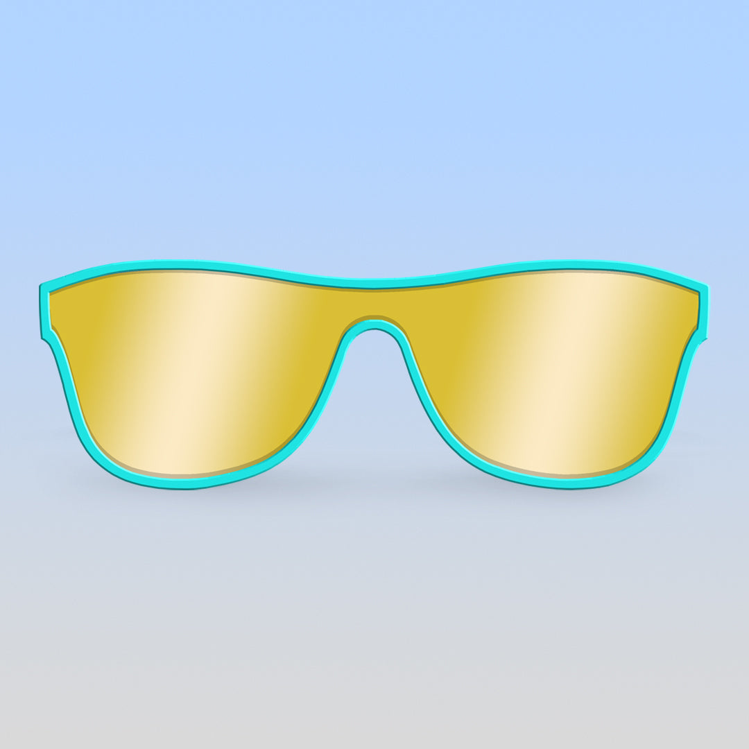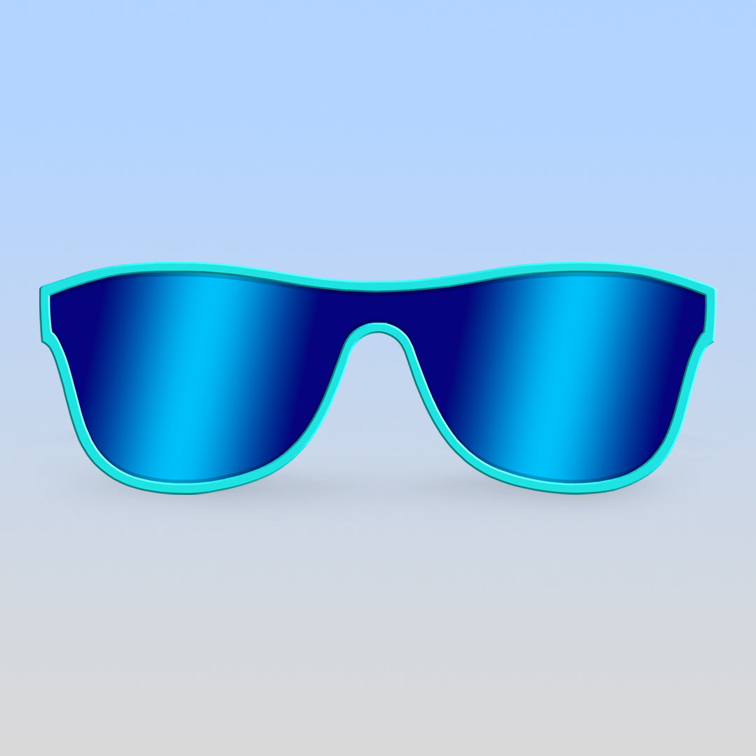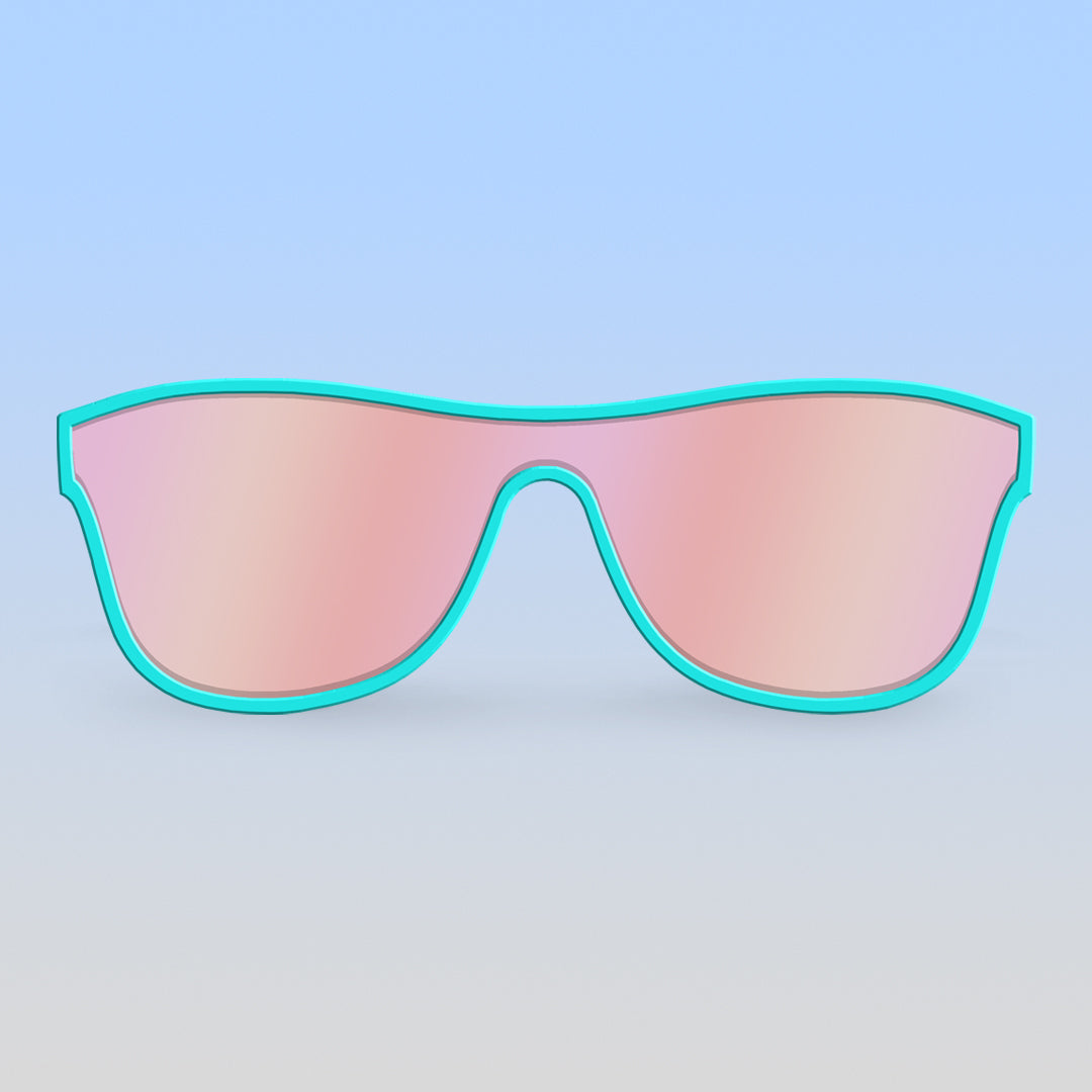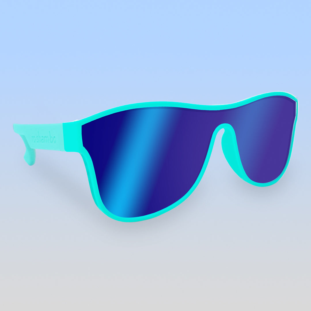 These Weird Science teal kids single shield sunglasses radiate an effortlessly cool and nostalgic vibe right out of the 80s. Named after the coolest hang out of the Bayside High crew—The MaxRoshambo's newest style of sunglasses melds super-neon, fun-spirited frame colors and mirrored polarized lenses for the coolest combos!
