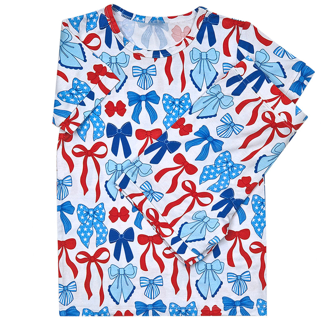 Featuring a sweet and festive print of red, white, and blue bows, this two-piece set is perfect for warm-weather celebrations and everyday play. Crafted from our signature buttery-soft bamboo fabric, it’s breathable, stretchy, and gentle on sensitive skin—keeping your little one cool and comfy from morning to night.
